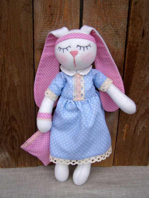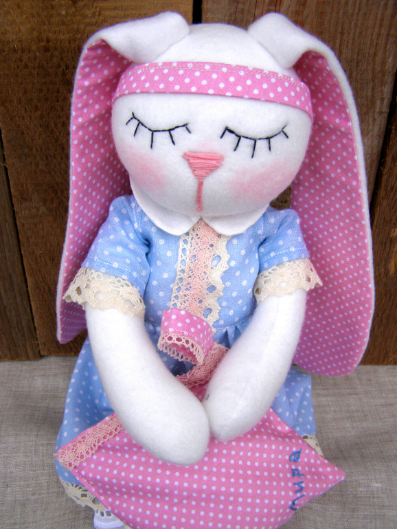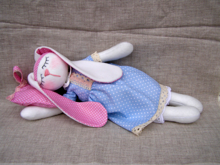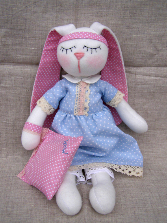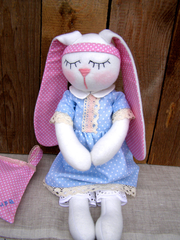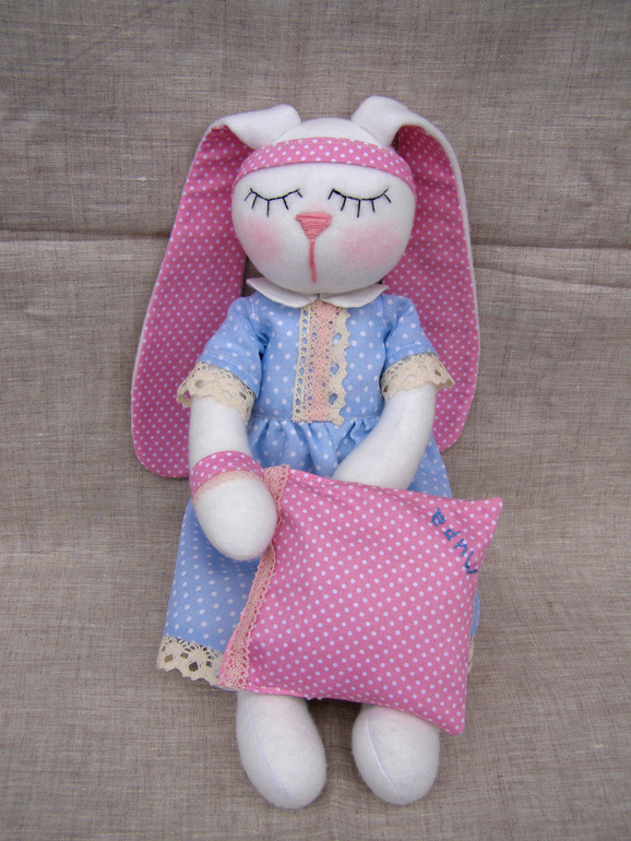 Зайка сшита из флиса....Платьишко на подкладке...всё 100% хлопок. Личико вышито мулине. Ростик 38см. Панталошки из хлопкового шитья на кружевной резинке. Вся одежка снимается. Ручки подвижные. Платье на кнопочке и завязочке. Подушечка наполнена лавандой, сшита из хлопка, наволочка снимается, можно постирать. Петелька есть для подвеса на ручку или возле кроватки. Заечка для годовалой малышки)