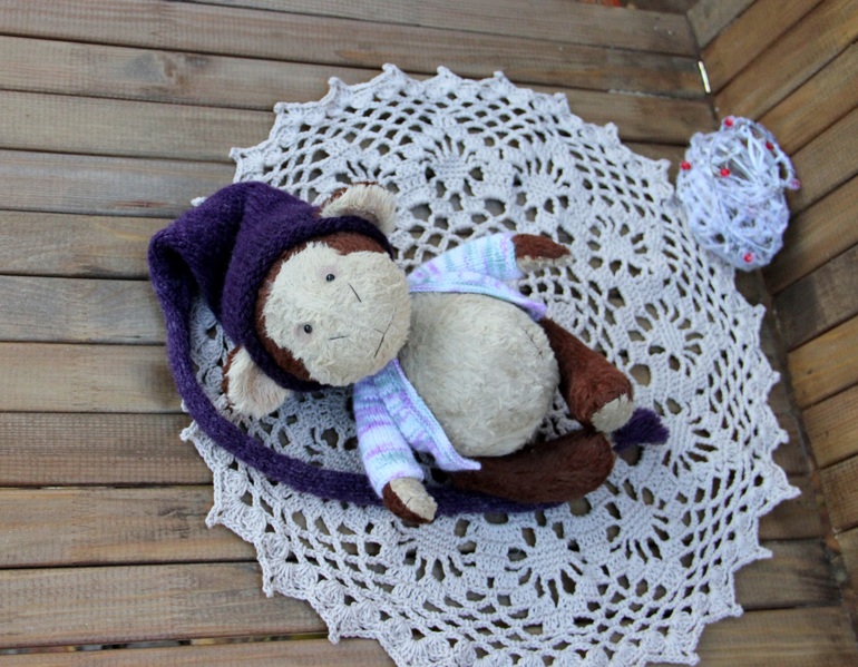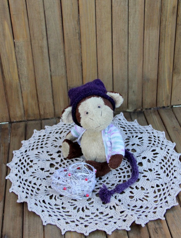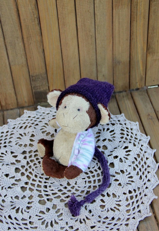 Тедди: мишки и их друзья.Сегодня солнце нас балует. Выглянуло с самого утра. Воспользовавшись этим, живо сфотографировала новые игрушки. Одну из них покажу сейчас, это Обезьянка (конечно, скоро же Новый год))) тедди, 18 см. сидя, 23 см. стоя. Тяжеленькая опилочная обезьянка, пошита из вискозы. Выкройка моя, а вот кофту и колпак получила из других умелых ручек))