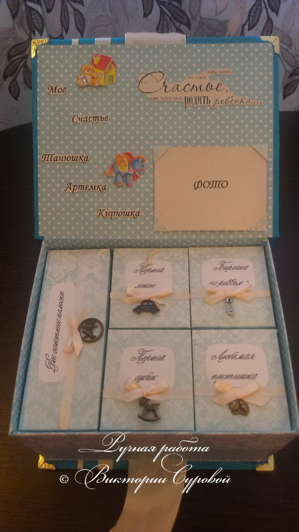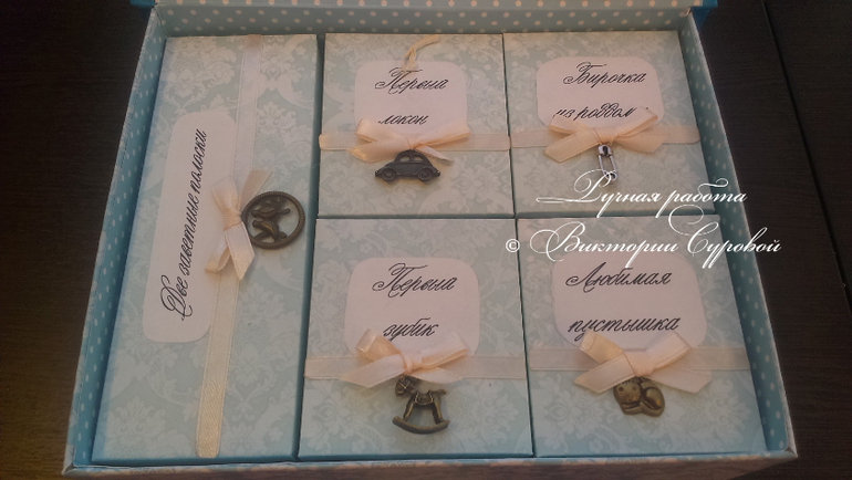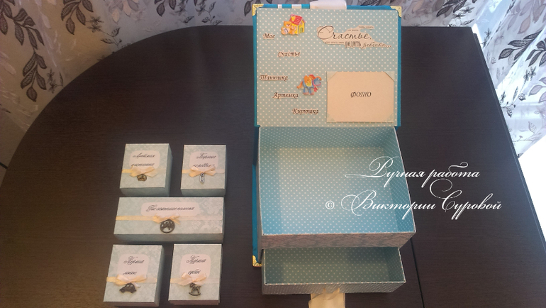 в ней 5 коробочек - для первой сосочки, локона, бирочки, зубика и теста. внизу выдвижной ящичек.