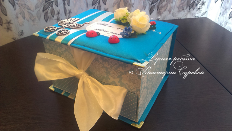 Сделана из переплетного картона, обтянута коробочка синтепоном и тканью. Украшена лентами, и декоративными украшениями
