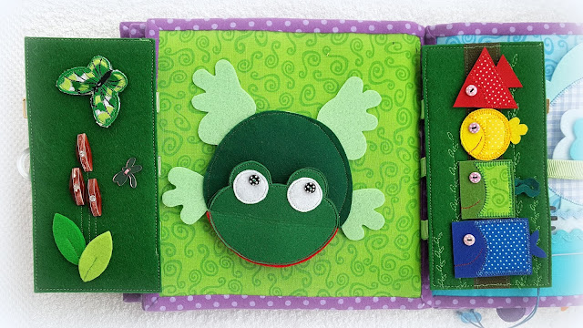 А за воротами... ну конечно обещанная лягушка. Слева камыши, стрекозка и бабочка. Справа рыбки на липучке разных цветов и форм.