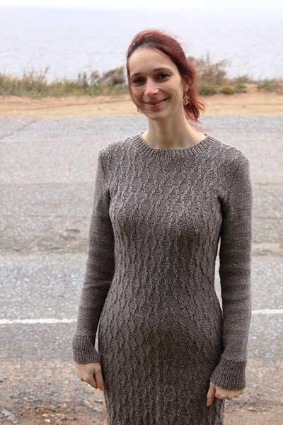 Пряжа Alize Lanagold (49% шерсть/51% акрил, 240м/100г, цвет - коричневый меланж), на мой 48 размер ушло 8 мотков. Спицы №3, №3,5 (для платья) и круговые №3, №4 для воротника.