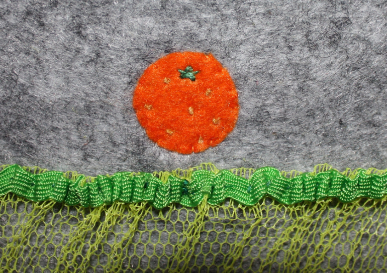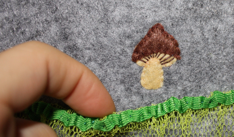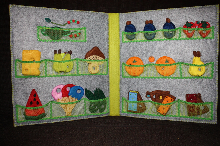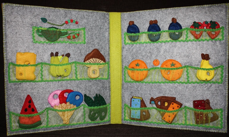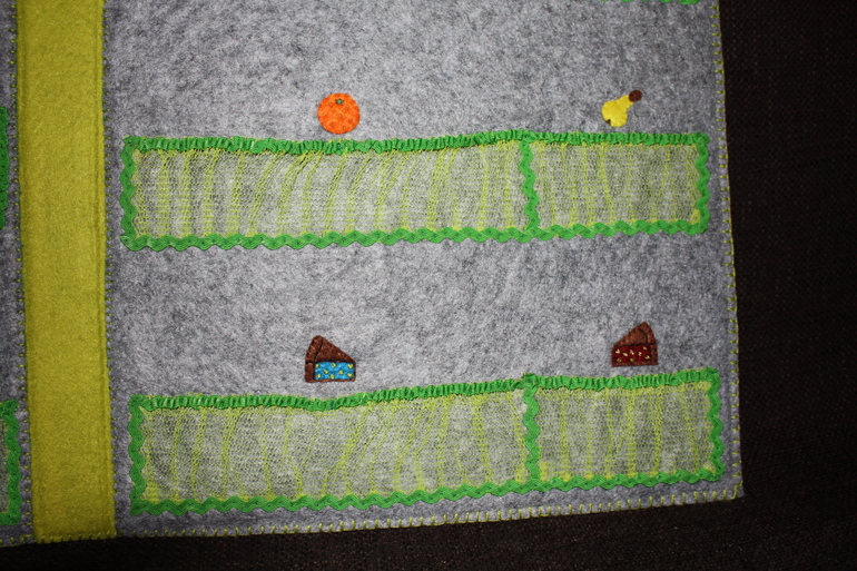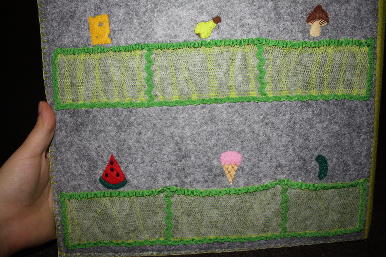 И теперь встал вопрос - а как же все это хранить. Если сделать просто мешочек и потом давать задания.. дай гусеничке 2 грибочка, 3 клубнички.. то ребенку в куче всего этого будет сложно найти и в процессе поиска он уже и позабудет сколько же надо чего дать гусеничке. Поэтому систематизация всего этого была просто необходима.. Сделала на 3 мм фетре кармашки. (пришивала их сборочкой и тесьму с верхом кармашков сшивала эластичной ниткой. поэтому кармашки растягиваются и туда спокойно все можно класть). Потом встал вопрос, а как же уплотнить эту папку.. Был у нас домик для творчества из плотнейшего картона.. такой огромный.. на нем можно было рисовать, приклеивать туда все что угодно и т.д. Он уже надоел и мы его собрали, т.к. занимал он пол комнаты. А картон я оставила. И вот этот картон и пошел в ход в виде начинки этой папки.. А снаружи 3 мм фетр. Скрепляла между собой фетр и картон с помощью "паутинки", кот продается по метражу в магазинах ткани. Края фетра сшивала нитками в тон папке. Для каждого фрукта или овоща я делала свой размер/высоту кармашков и чтобы ребенок знал.. что и куда класть возле кажд. кармашка я пришила мини копию нужного фрукта или овоща. Размер папки 35*40 см