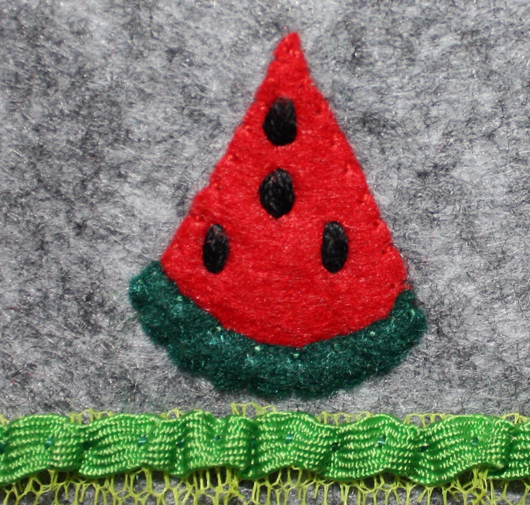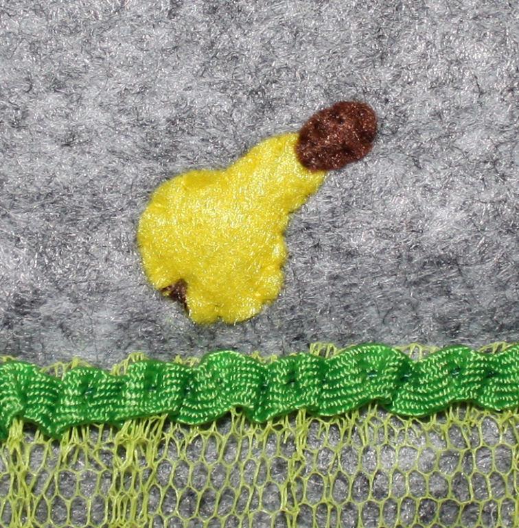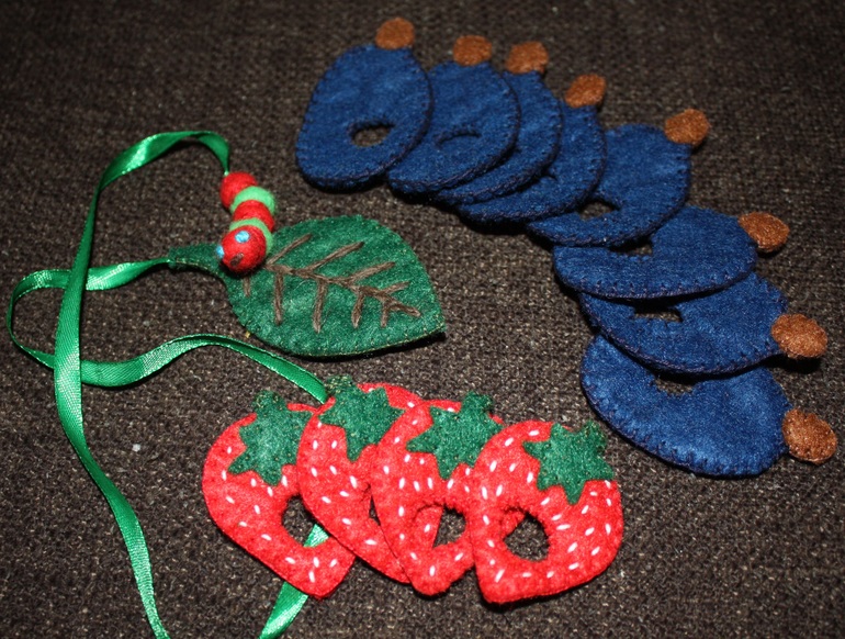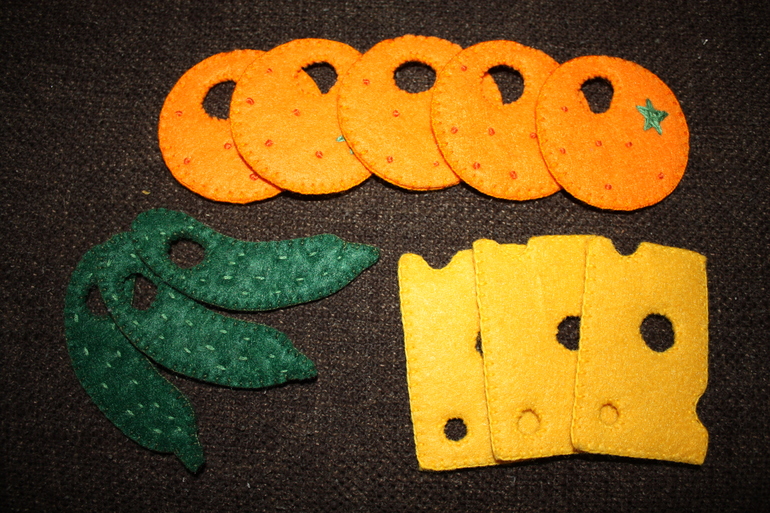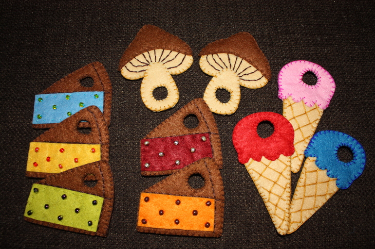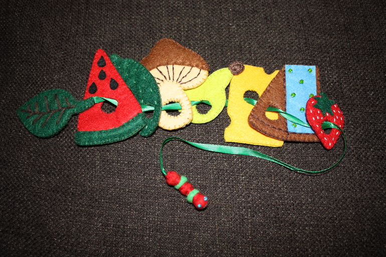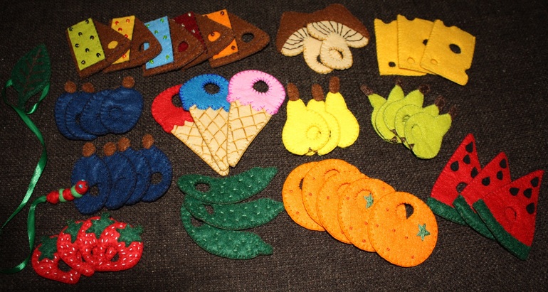 А теперь по порядку. Захотелось мне для садика сделать эту развивашку. Детки у нас в группе разного возраста (от 2.5 до 3.5), поэтому для одних это будет просто игрушка-шнуровка, а уже для других это будет обучение счету. Т.е. дай гусеничке 2 апельсинки, 3 грибочка, 5 тортиков и т.д. Мой ребенок просто души в этой гусеничке не чаял, когда она была у нас еще дома. Он все прибегал ко мне и спрашивал, что еще хочет скушать гусеничка и сколько )))). Все фрукты-овощи двухстронние, т.е. рисунок на 2-х сторонах. Сделаны из 2-х слоев 2 мм фетра. Итого фигурка 4 мм, т.е. довольно плотная и ребенку сложно будет ее сильно деформировать. Размер фигурок тоже довольно крупный (ниже будет фото с моей рукой для наглядности) Ниже фото самих фигурок: