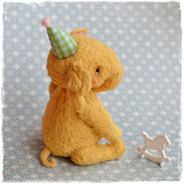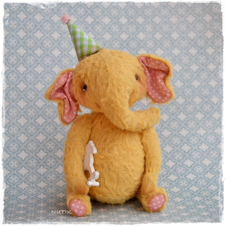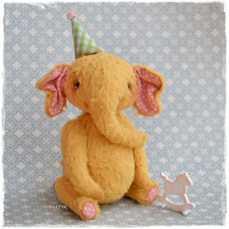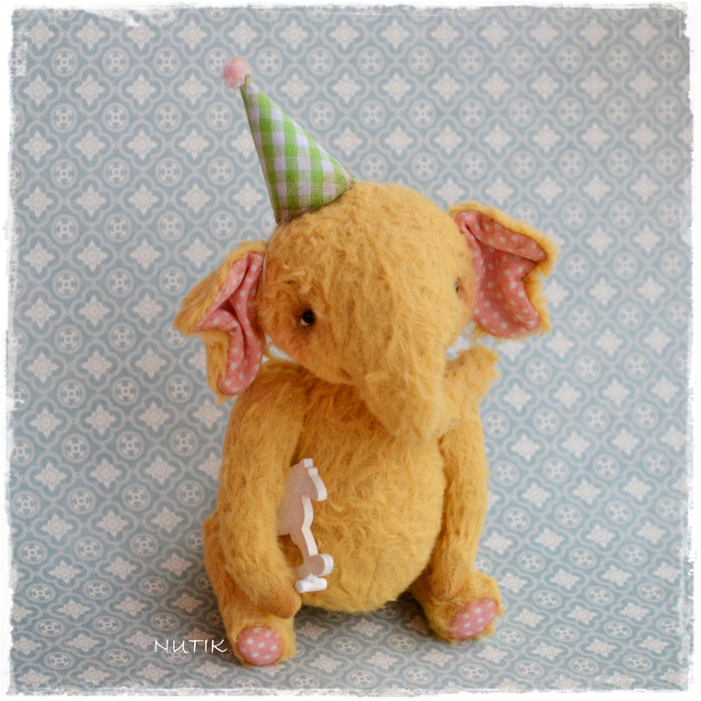 Слонечка примерно 15 см ростиком, пошит из немецкой вискозки, набит опилочками, утяжелен мет.гранулятом,, голова и лапки подвижные на шплинтовом креплении, глазки стеклянные, тонирован маслом