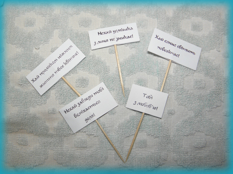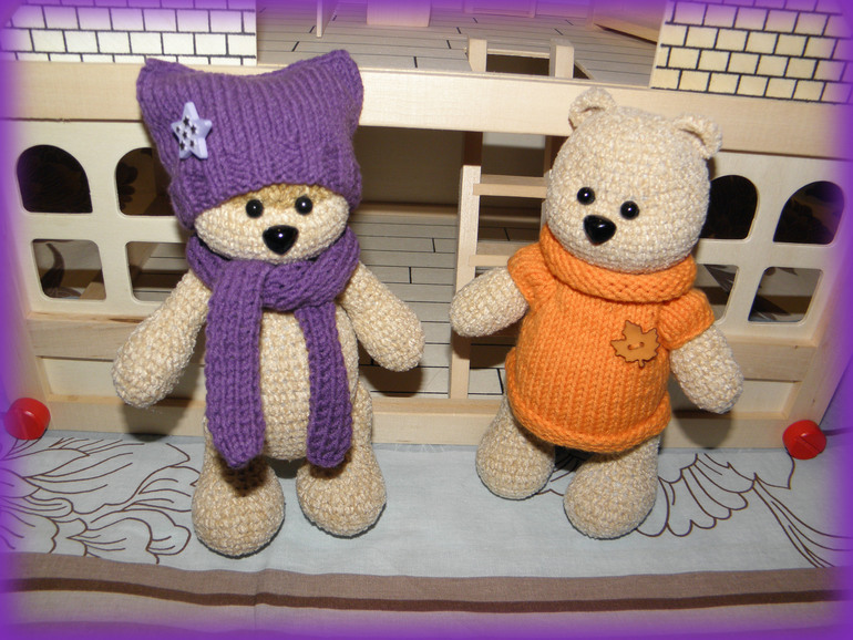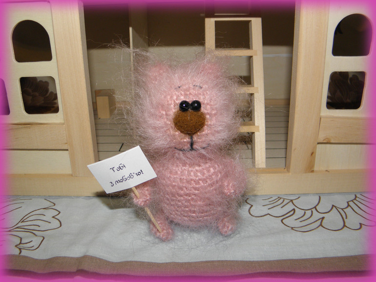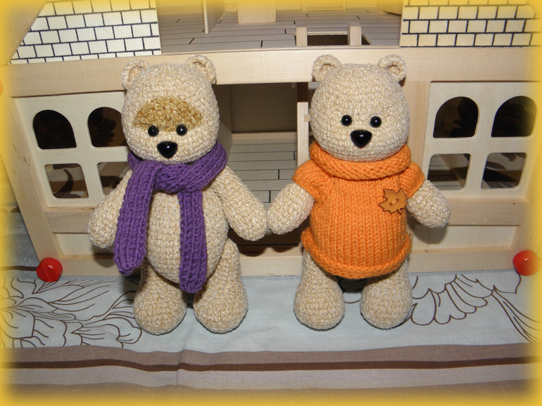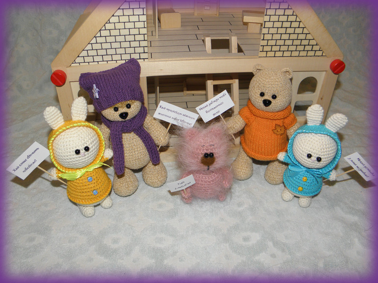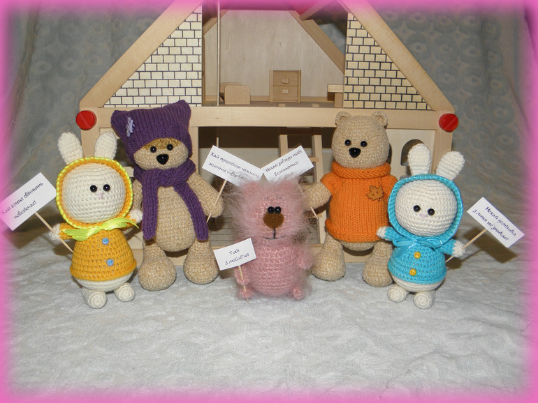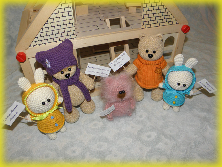 Связаны из пряжи джинс,велюровой ниточки и мохеровой.все плотненько набиты синтепончиком.В ручонках держат плакатики с приятными пожеланиями на украинском языке.