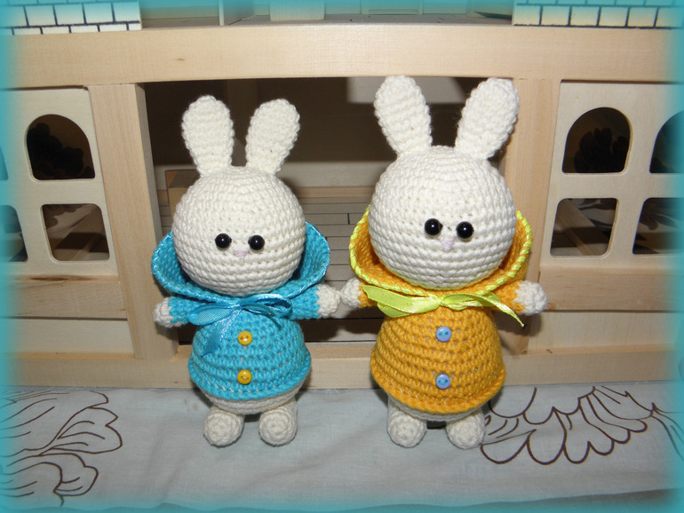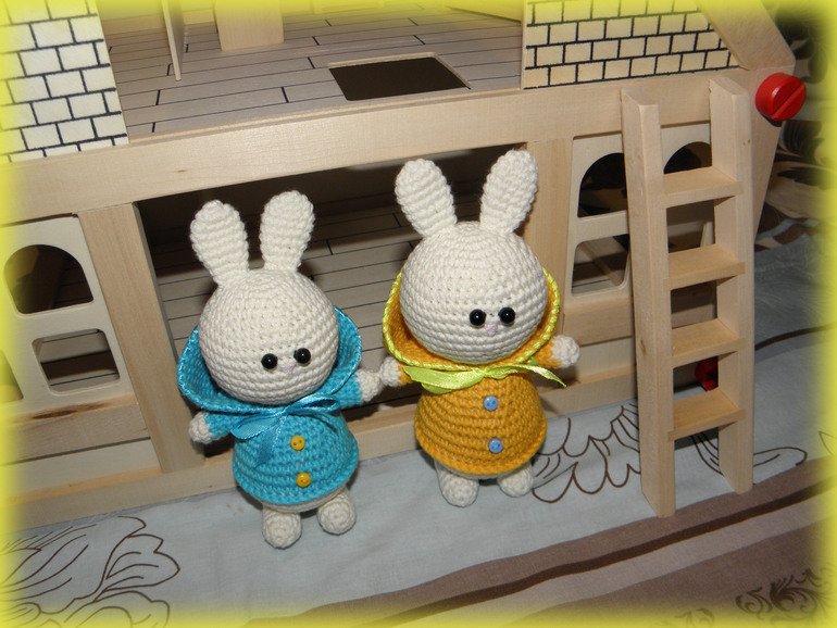 Зайчата Рон и Себастиан,росточком 15 и 16см.В ручках у них плакатики (дословно)"Пусть улыбка с лица не исчезает", "Пусть солнце светит всегда(постоянно)".