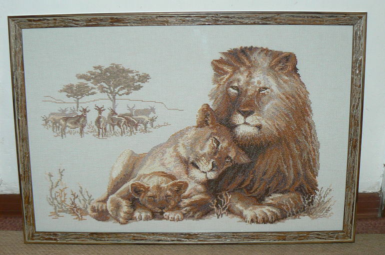 Многострадальный Львиный рай от Риолис, вышивался в подарок мужу, тк он Львович и уважает львов. Шила с перерывами 4 года, но в один прекрасный момент взяла себя в руки и закончила за 2 недели. Подарок торжественно вручен мужу на юбилей, был встречен на ура и теперь является семейной реликвией