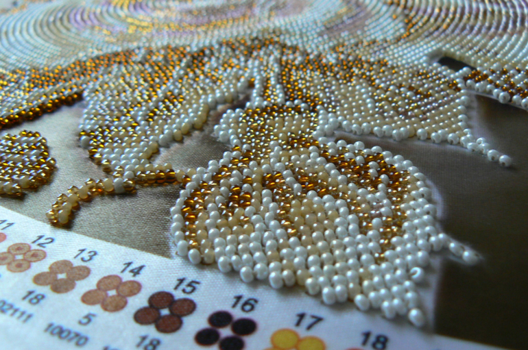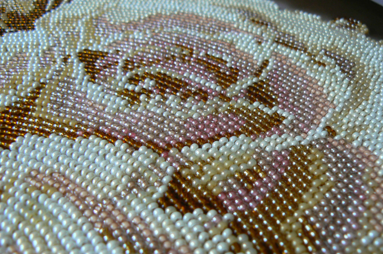 Наверное, всем знакомый сюжет от Тэлы Артис. Шелковая заготовка ждала своего часа в закромах около 3 лет. Тк у меня не было рамы для вышивания подходящего размера, пришлось ее одолжить на 2 месяца. Вышивала быстро, аж до тошноты, принималась за работы в каждую свободную минутку. Осилила! Пришила 14159 бисеринок. И всё-больше не хочу! Работа пока не оформлена, нет финансов )