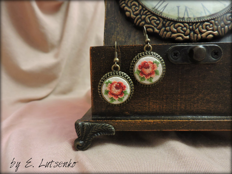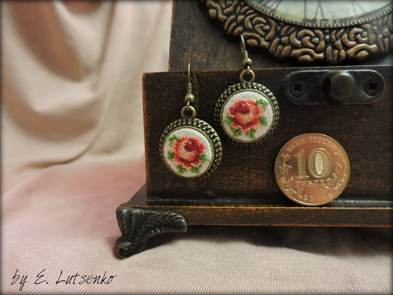 Бижутерия для слингомам. Слингобусы. Грызунки.Серьги с розами вышиты по мотивам старинной схемы, общий размер 2 см. Размер самой розочки всего 14 мм.