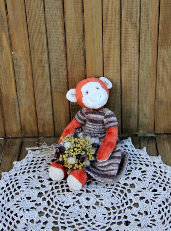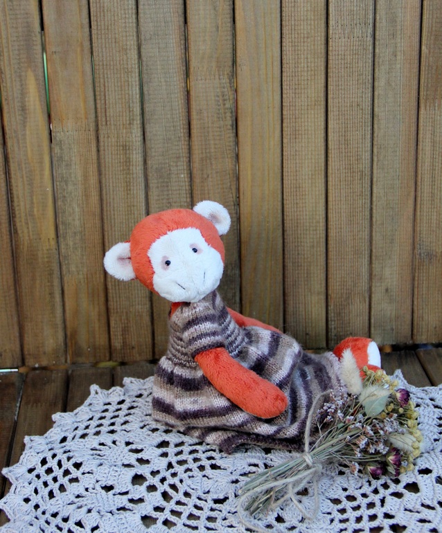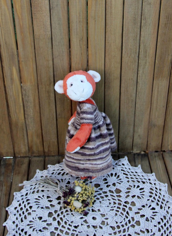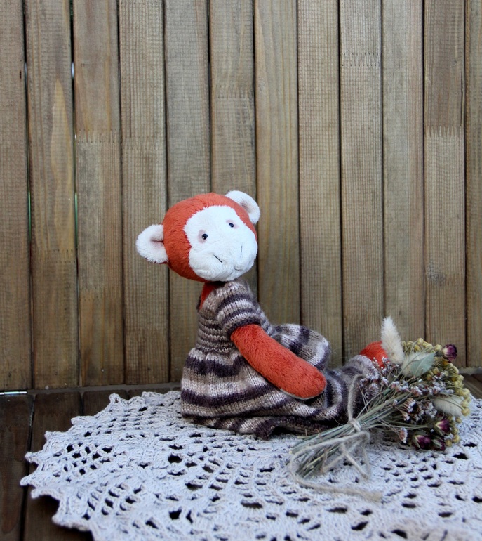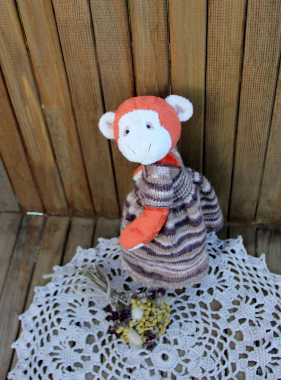 Игрушечный мир - животныеОформилась еще одна Обезьянка в стиле Тильда. Небольшая голова с аккуратными ушками, длинные ручки-ножки и, конечно, дизайнерский наряд))) Часто жалею, что не умею вязать,чтобы самой создавать подобные шедевры для игрушек!