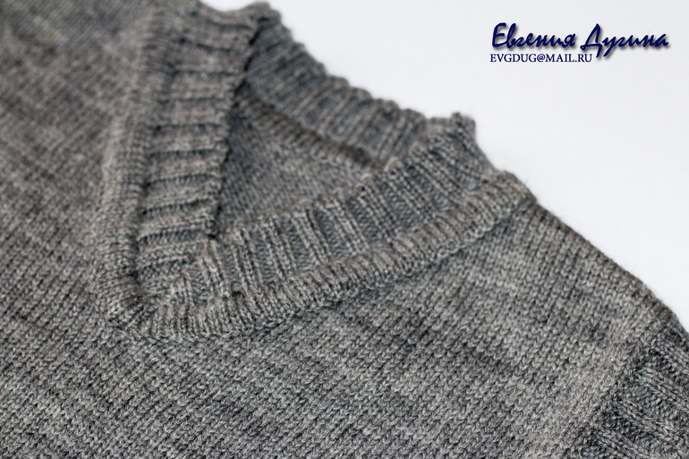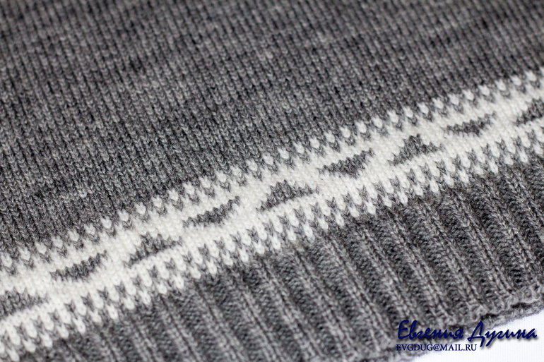 Пожелания к жилету были такие - "пусть будет просто серым, без пестроты". Я, конечно, посвоевольничала и сделала снизу небольшую жаккардовую полосочку.