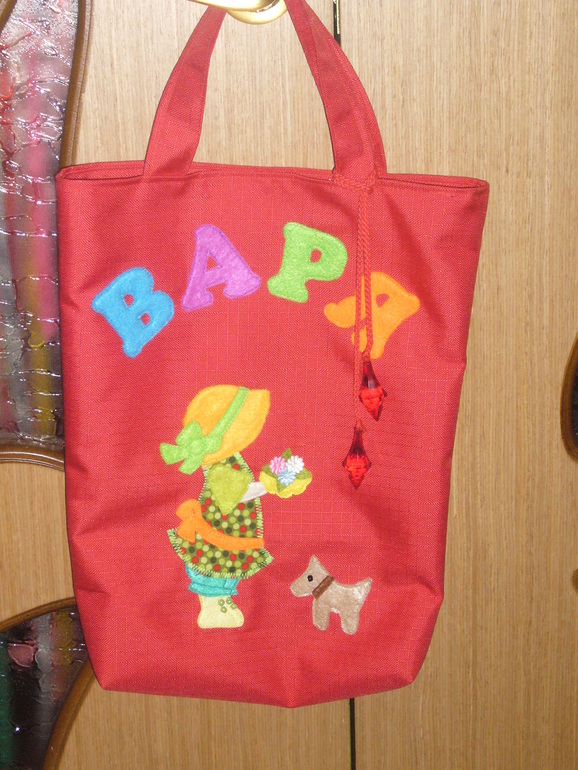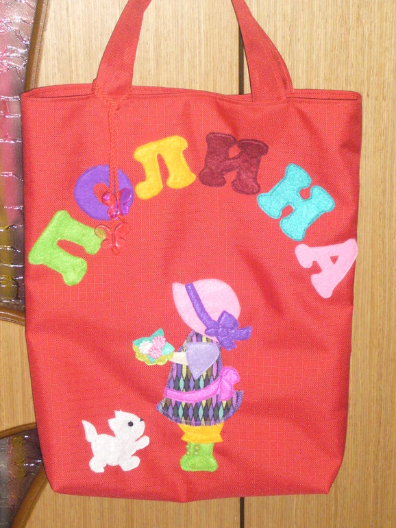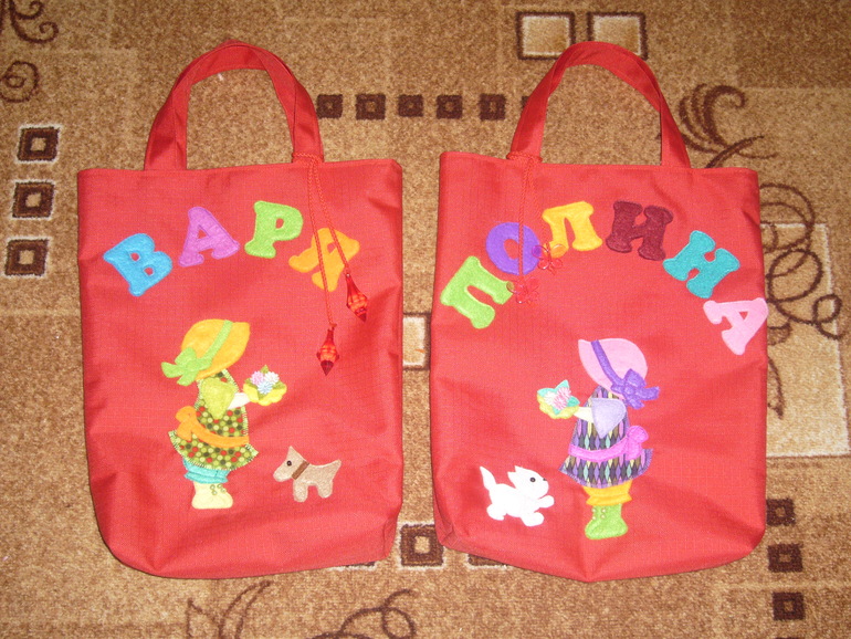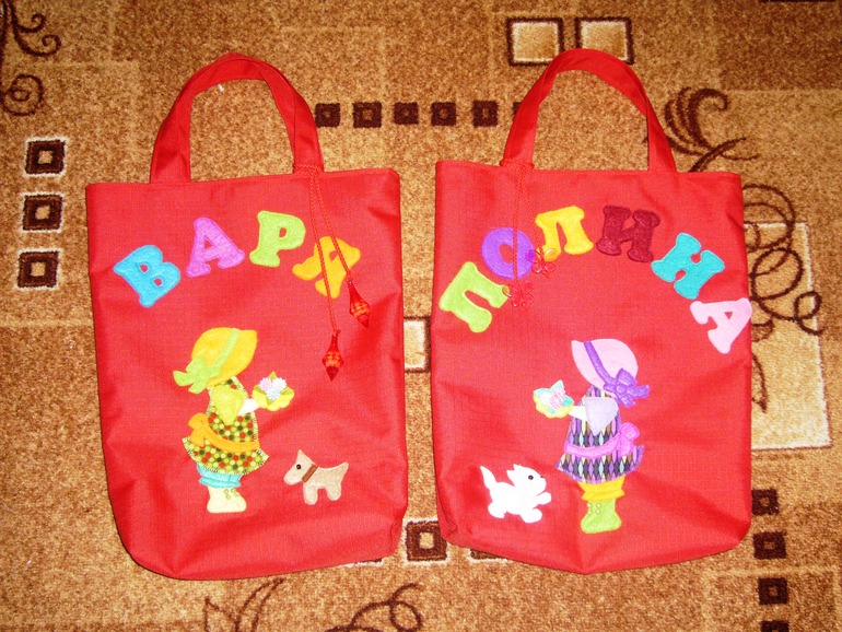 Шитье одежды, выкройки, ремонт одежды, шторы, швейные машины (уже приобретенные)Покажу две именные сумочки,которые я выполнила для двух сестренок-двойняшек. Сумочки предназначены для хранения запасной одежды в шкафчике детского сада,а также для хранения мелких игрушек ,книжек,тетрадок и т.д. С такой сумочкой вещи вашего ребенка никогда не засунут в чужой пакет и не потеряют.А также сумочка является оригинальным аксессуаром и второй такой вы точно нигде не встретите,а ваш малыш будет выгодно отличаться от остальных. Размер 30/35 без учета ручек,аппликации из фетра,ткань кордура,подкладочная ткань.В этот раз еще использовала ,на ручках сумочек, подвески декоративные,по желанию заказчицы.