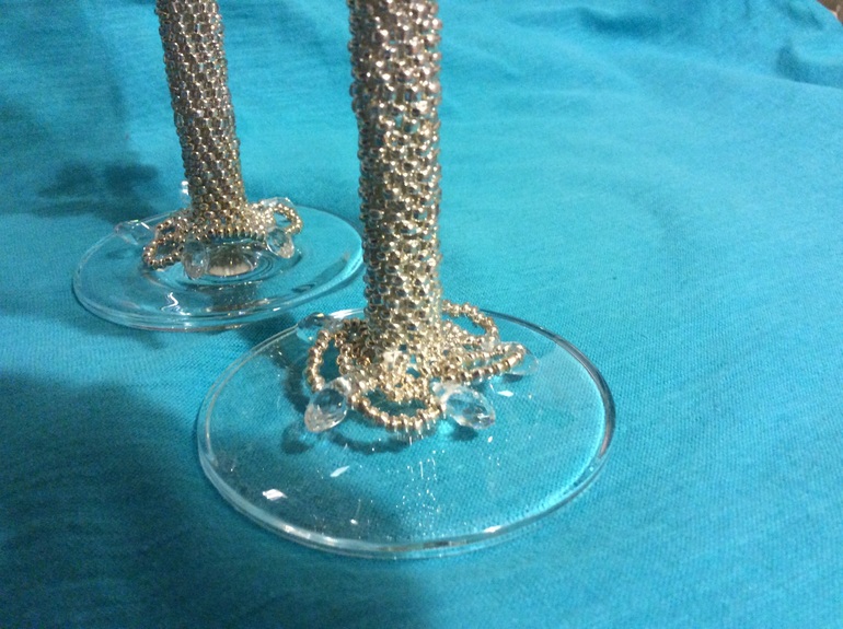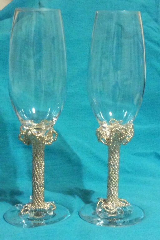 Надо что-то не только на ножках, но и на самих бокалах. Как вариант, прозрачный клей и бисерная обсыпка. А то ножки оплетены, а сами бокалы "голые". Это моё IMHO