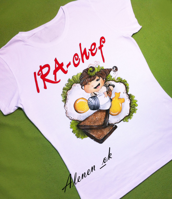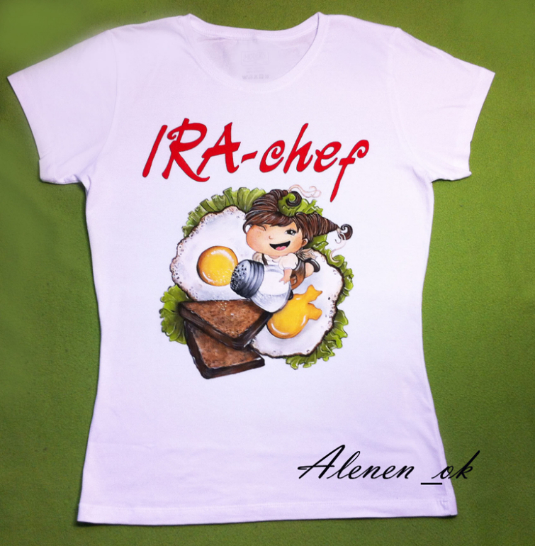 Роспись по ткани, батикВ срочном порядке была изготовлена за один вечер вот такая "вкусная"футболка в подарок девушке, которая любит, а самое главное умеет очень вкусно готовить! Как вы поняли, девушку зовут Ира, отсюда и незамысловатая надпись!
