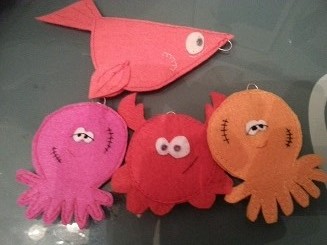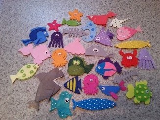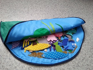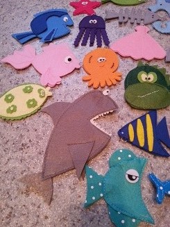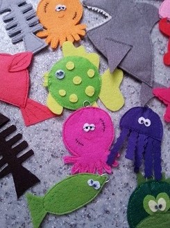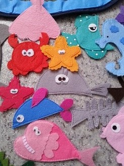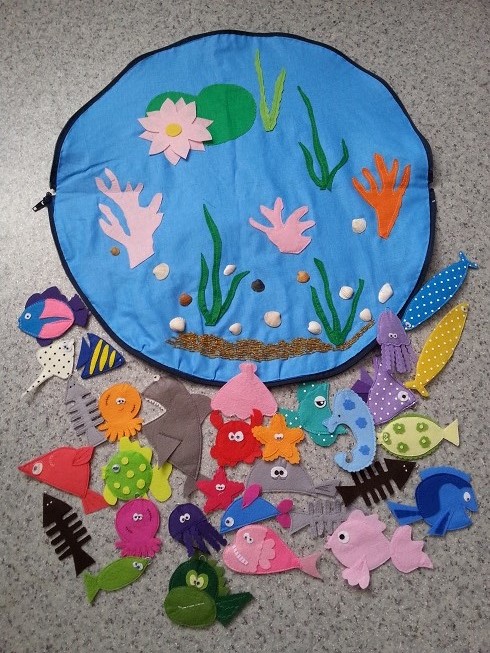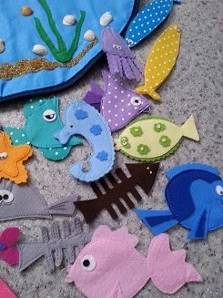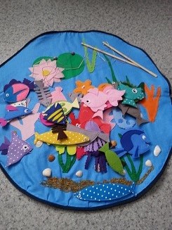 Пошилась у меня такая рыбалка из фетра), в рыбки вшиты скрепочки, на удочках магнитики) рыбки двухсторонние, все прошитые, глазки на некоторых вышиты, на некоторых нарисованы маркером по фетру. Прудик складывается и закрывается на замочек для более удобного хранения)))