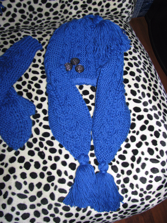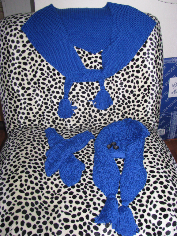 Связала для себя синий комплект - шапка-ушанка, бактус, вырежки.