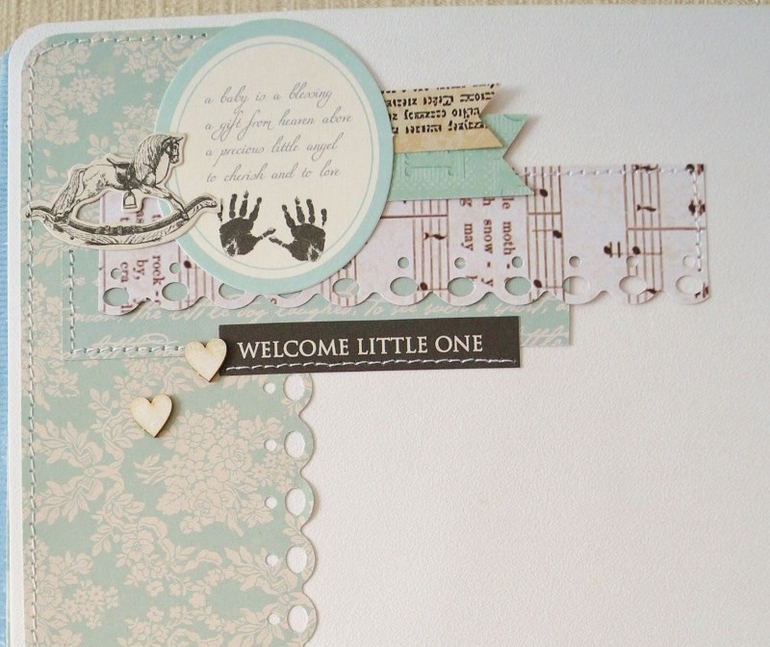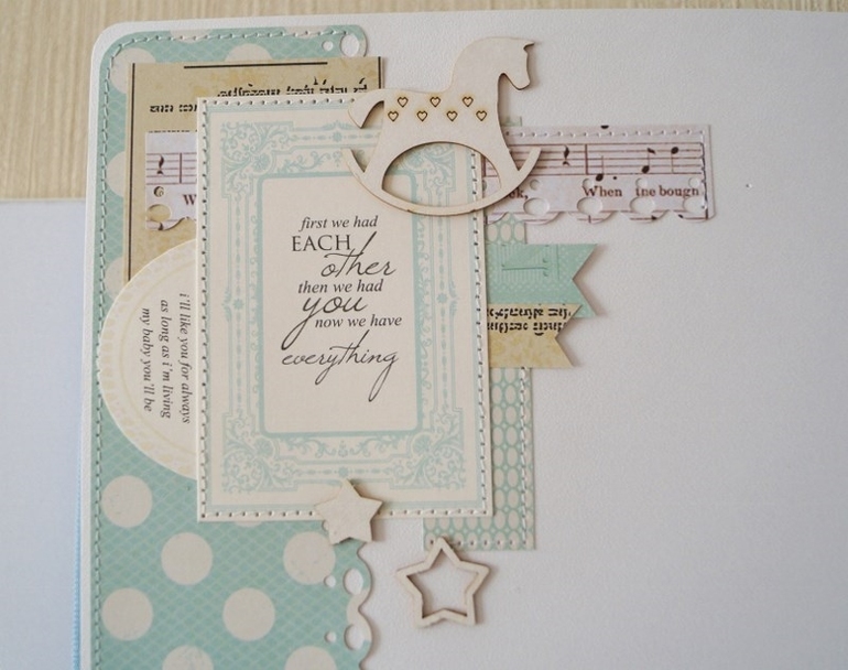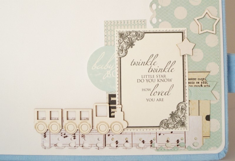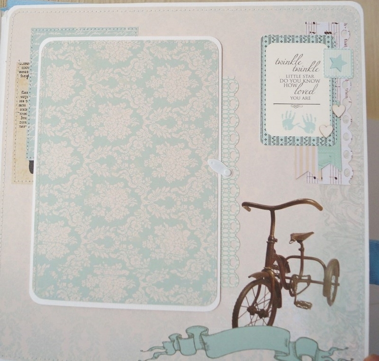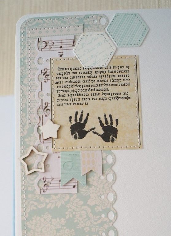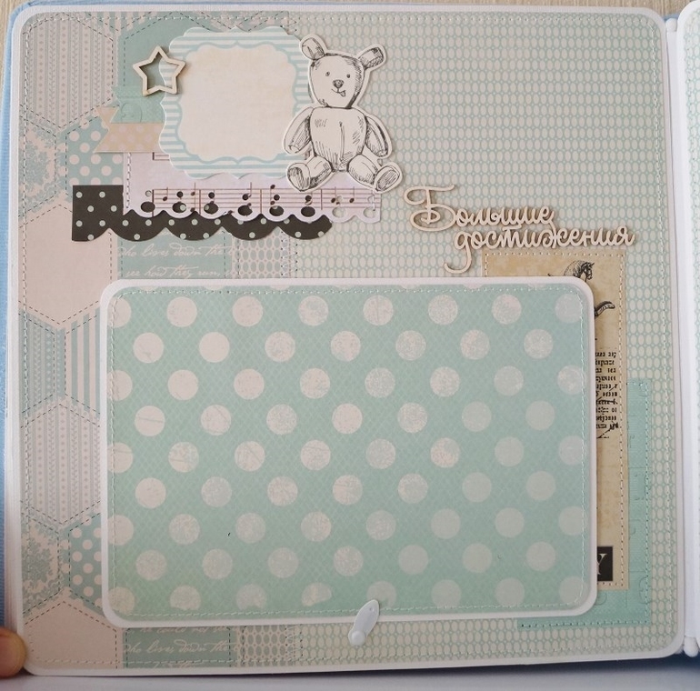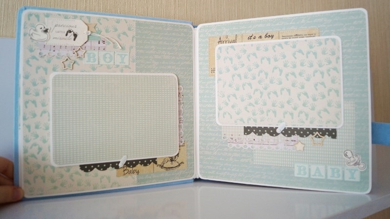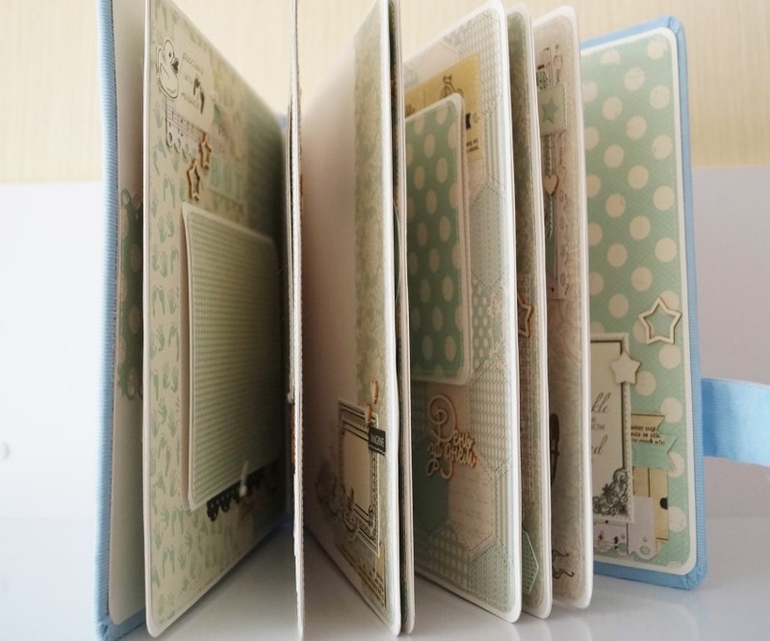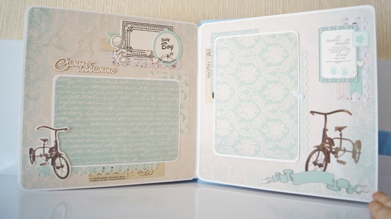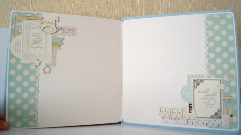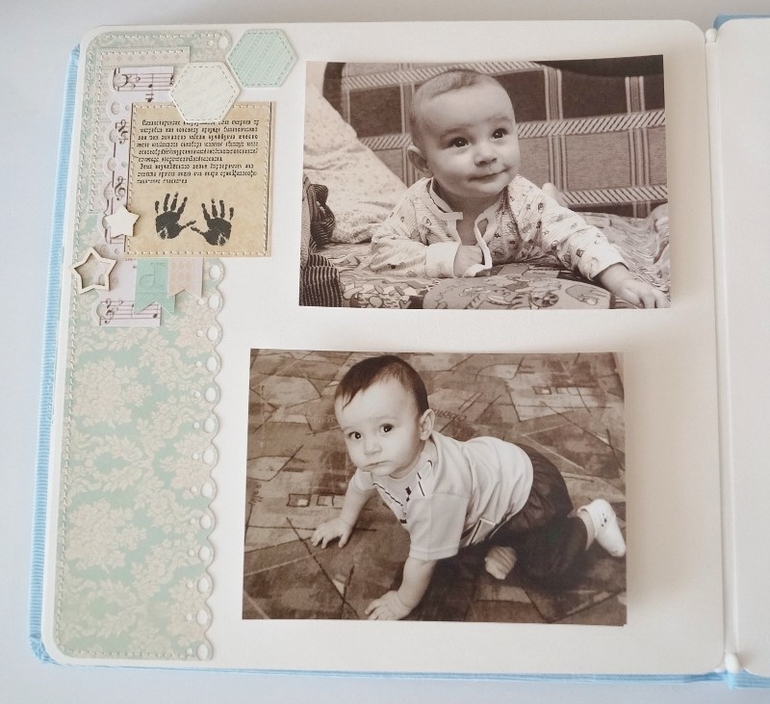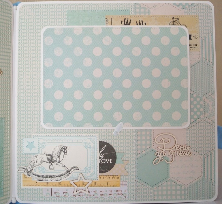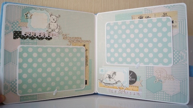 Первый альбом выполнен по мотивам альбома для внуков, который я делала уже давно. Оставалась у меня бумага и высечки, вот и решила пристроить. А так как бумаги было всего ничего, часть разворотов оформила частично, без подложек, для самостоятельного размещения фото разного размера.