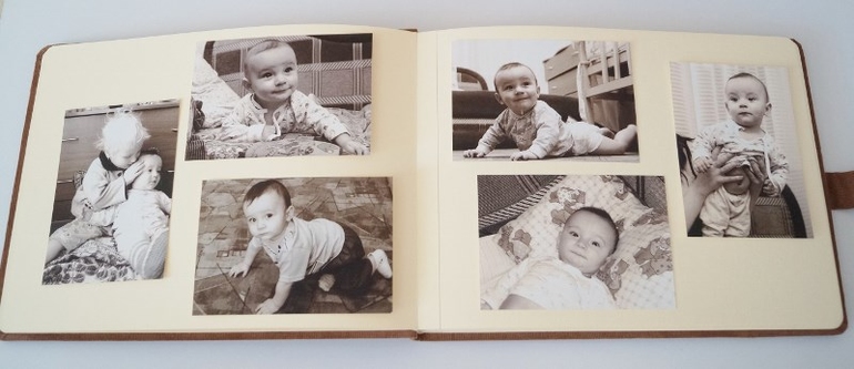 ну и второй альбом - формат А4, оформлена обложка, внутри 20 листов плотного картона цвета слоновой кости. Для размещения фото разного размера