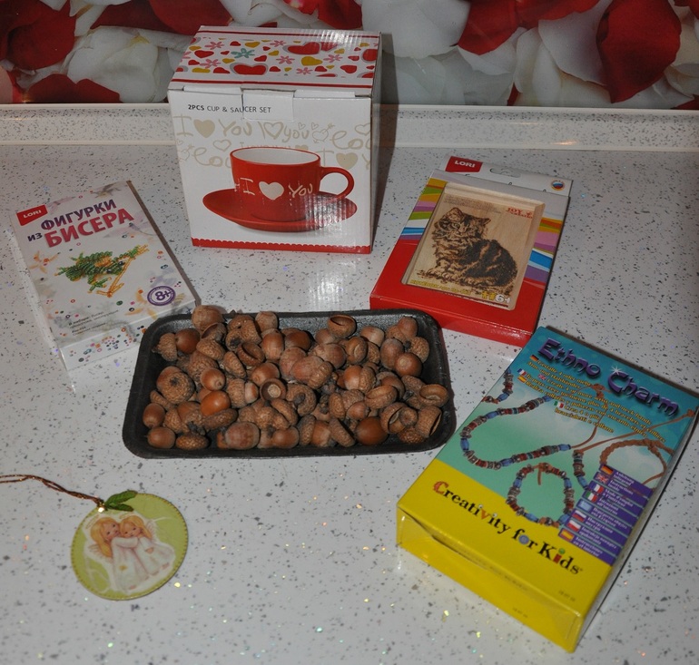 Задолжала отчетики по обменам некоторым девочкам. Исправляюсь. Состоялся у нас обменчик с Татьяна Шарапова . Основной для меня предмет обмена-канадские желуди, красота! Менялись на мои рукоделки. Танечка прислала нужности мне на подарочки. А также сделала сюрприз-красивую подвесочку с ангелочками. Смотрим.