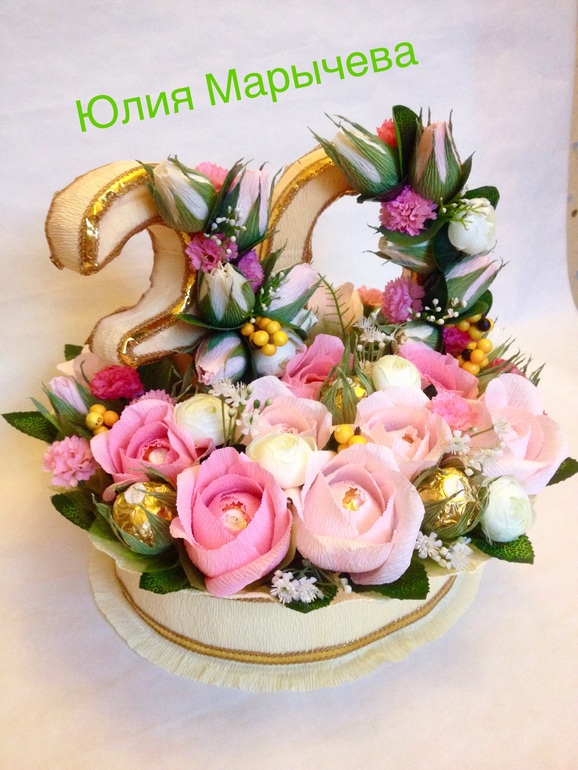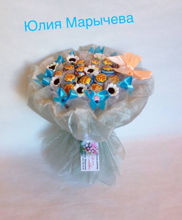 Юля, какие замечательные работы!!! Первый букет шикарен!!! Только хочу немного высказаться, на мой взгляд чупсовый я бы в более яркую органзу завернула, он бы интереснее смотрелся, ярче! Ну и про цифры на тортике, надо было бы лучше использовать тесьму Булет или Шанель ... Не сочти за обиду я не критикую, я советую лишь чтобы работы были безупречными)