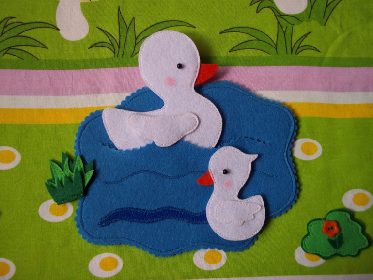 В пруду могут плавать утки и гуси (есть прорезь, куда вставить фигурки, и волна из велкроткани)