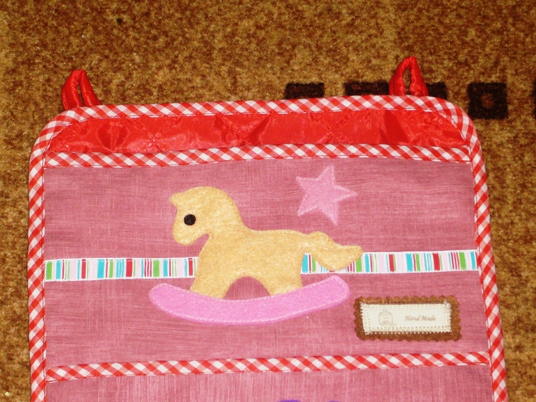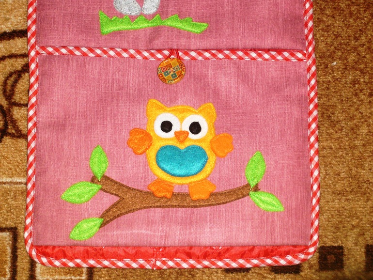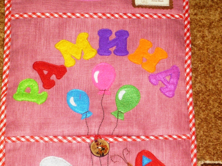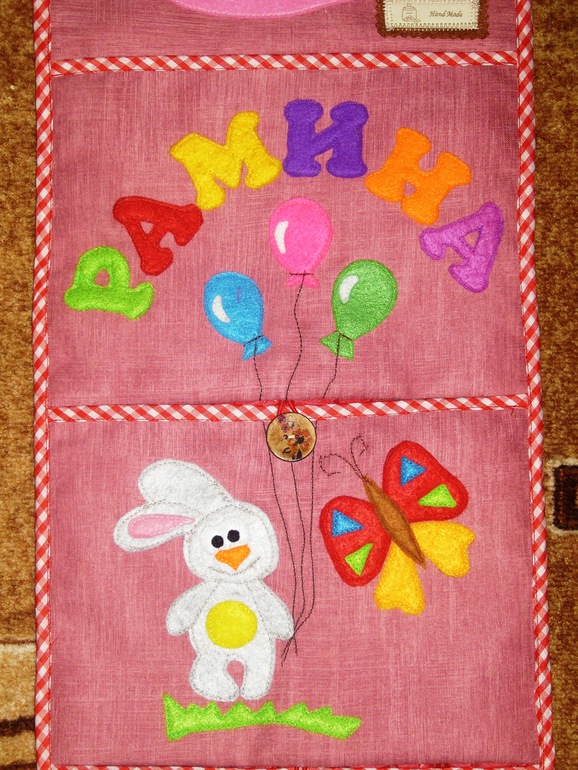 ФетрПокажу, уже даже не знаю какие ,по счету, новые кармашки .Предназначены для хранения запасной одежды в шкафчике детского сада. Выполнены на заказ для девочки с необычным именем .Аппликации из фетра,основание из термостежки,имеется две петельки для подвеса,два нижних кармашка застегиваются на пуговички,верхний немного поменьше,можно хранить всякие резиночки ,заколочки,расческу.Жду одобрения заказчицы.Смотрим,много фото.