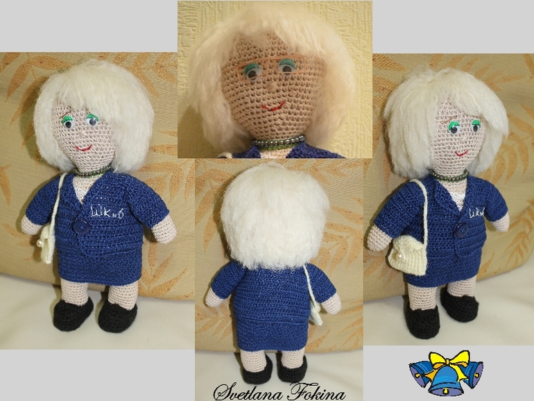 Заказали мне в подарок учительнице - учительницу)) Ну, намучилась я с ней конечно, особенно с волосами, все-таки вязание игрушек не мой конек, а т.к. было свободное время согласилась. Вязала на глаз, без всяких описаний, но заказчица была очень довольна, что не может не радовать, не зря мучилась)))