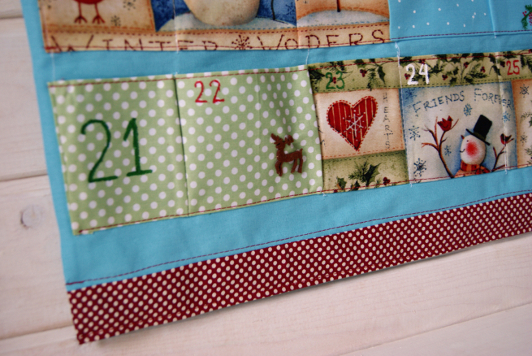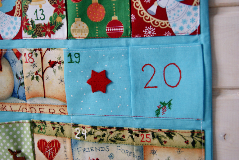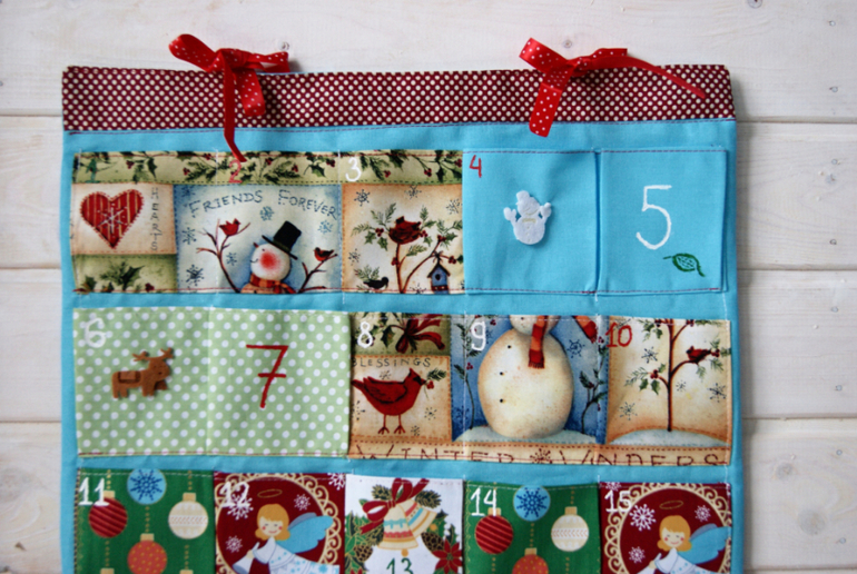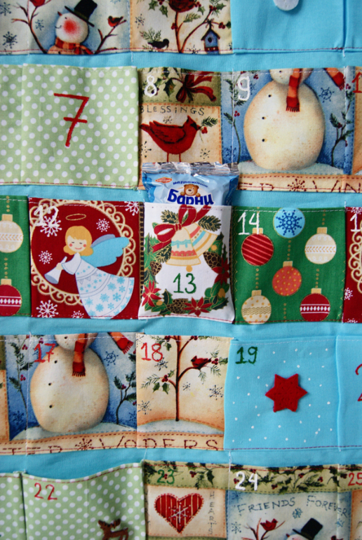 Цифры написаны вручную акриловыми красками для ткани. На некоторые кармашки добавила фетровые вырубки- олени, снеговик, звезда.