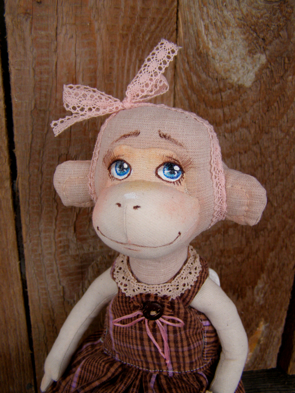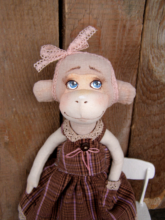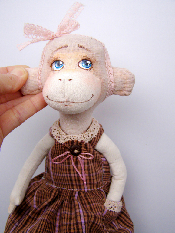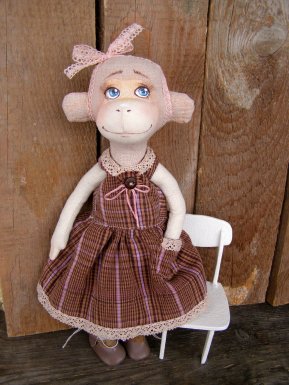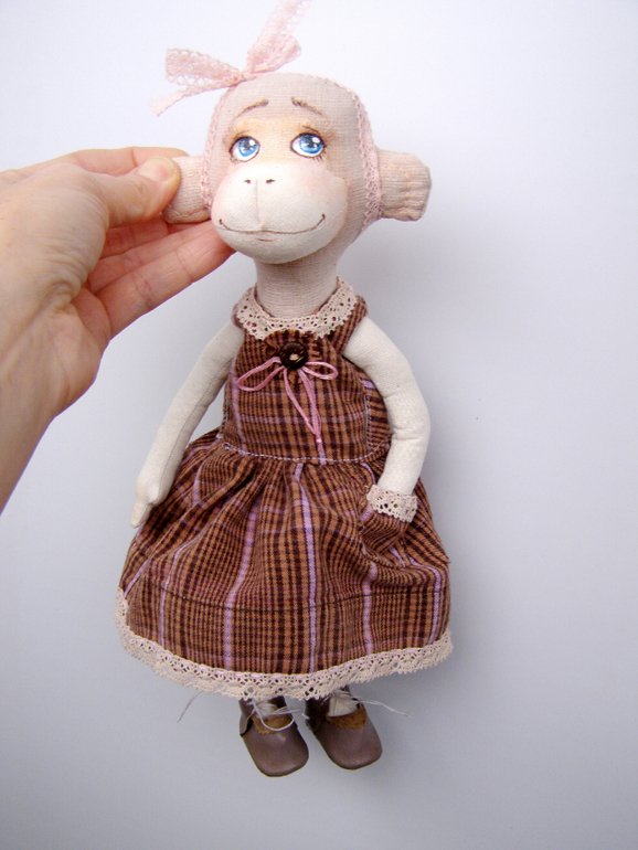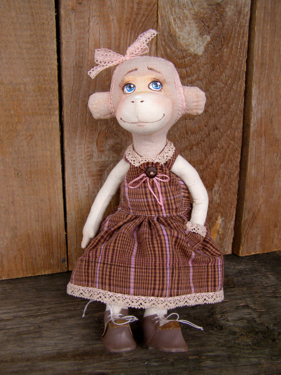 Игрушечный мир - животныеСшилась обезьянка Лёлька. В платьице из хлопка в клетку и хлопкового кружева .
