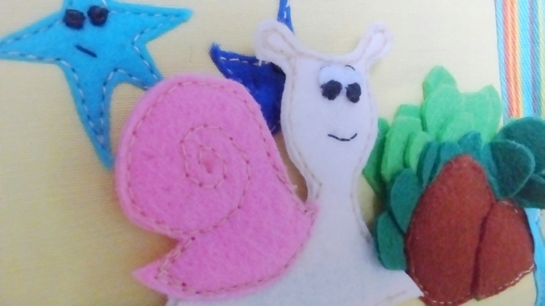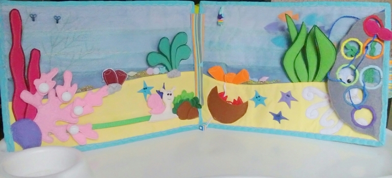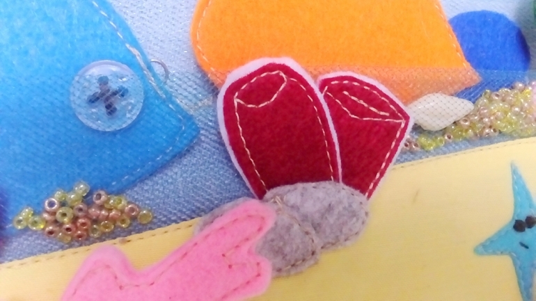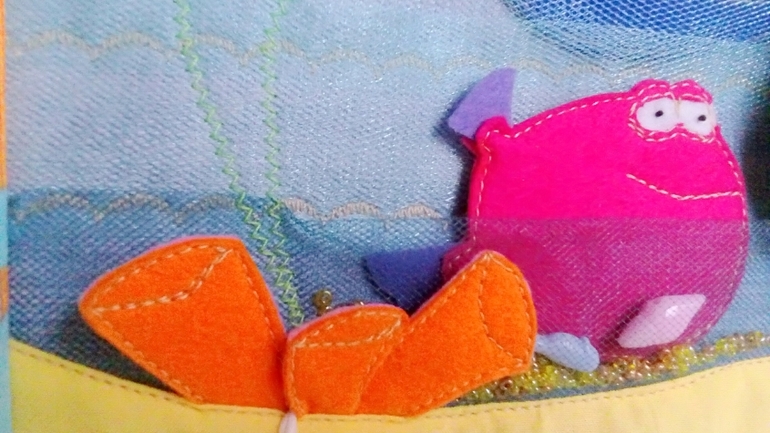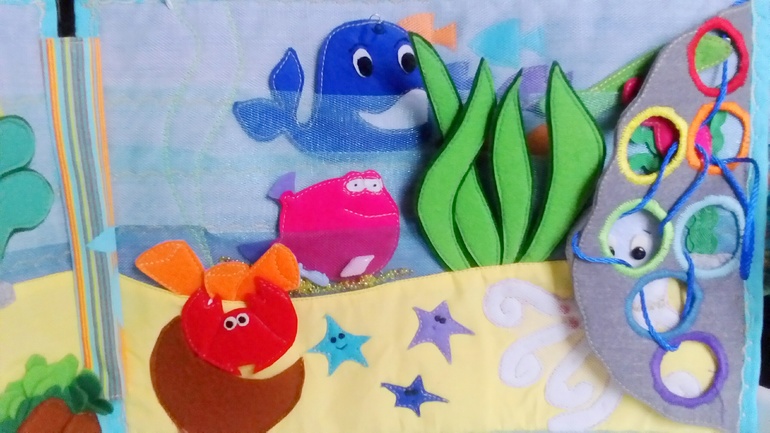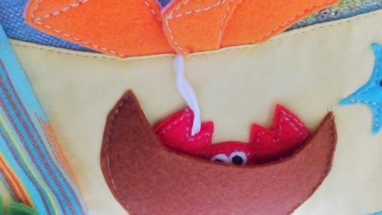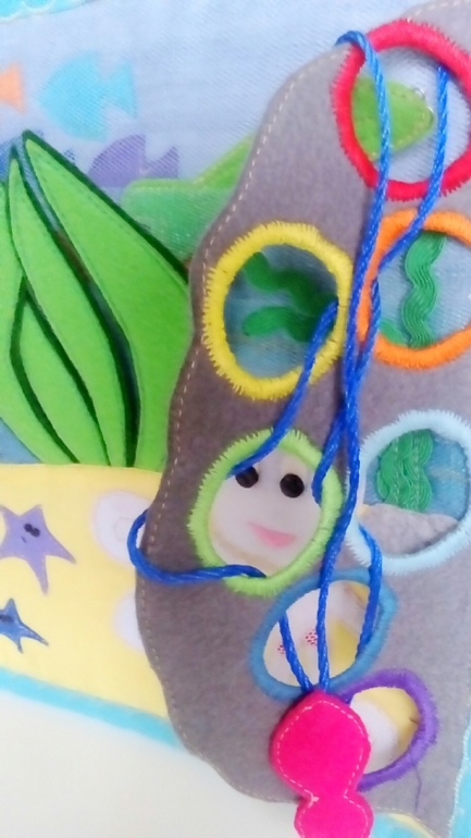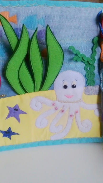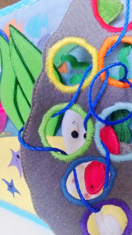Осьминожка прячется за камнем. Камень - шнуровка с радужными колечками. На шнуре маленькая розовая рыбка.