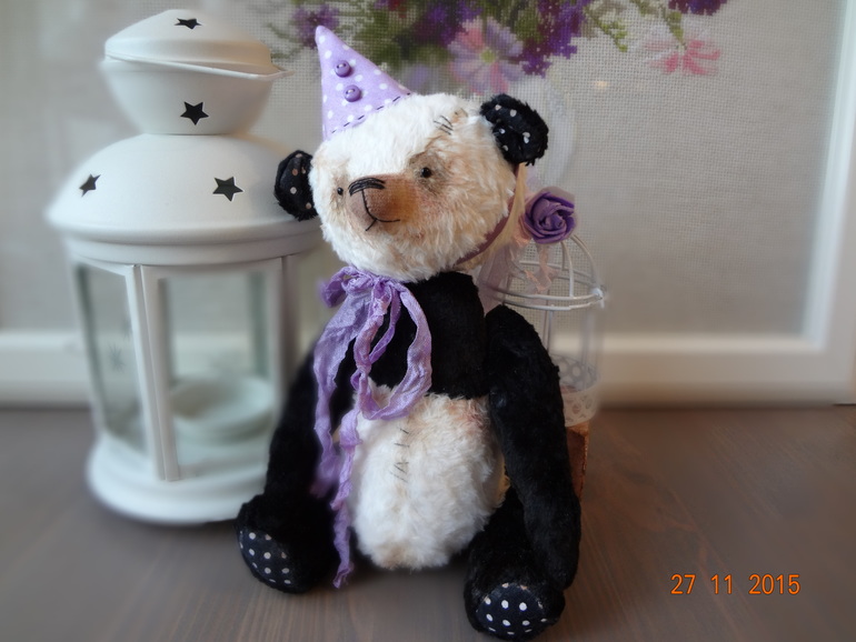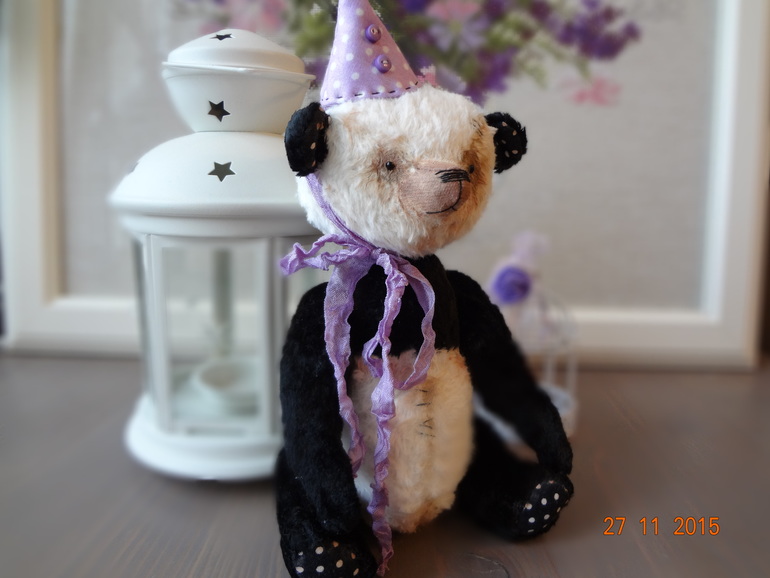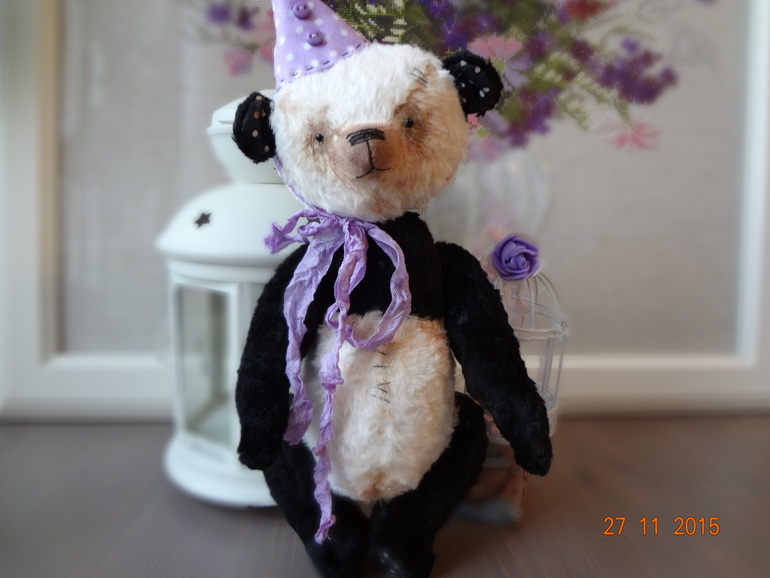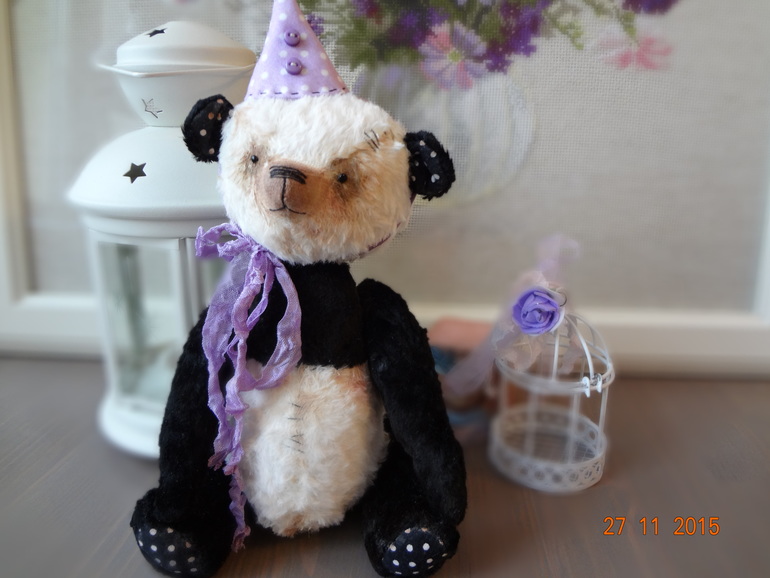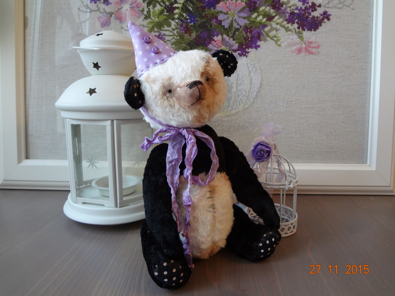 Игрушечный мир - животныеСегодня появилась на свет акая вот праздничная пандочка. Ростик 20см. Сшита из вискозы и винтажного плюша,набита плотненько опилочками,утяжелена стальным гранулятом. 6 шплинтов,голова покачивается. Пандочка состарена,тонирована,есть немного штопки,сшита в винтажном стиле. А на голове праздничный калпачок,сидит ждет праздника))). Авторская выкройка,сшита полностью вручную,с большой любовью и теплом))).