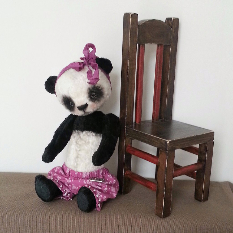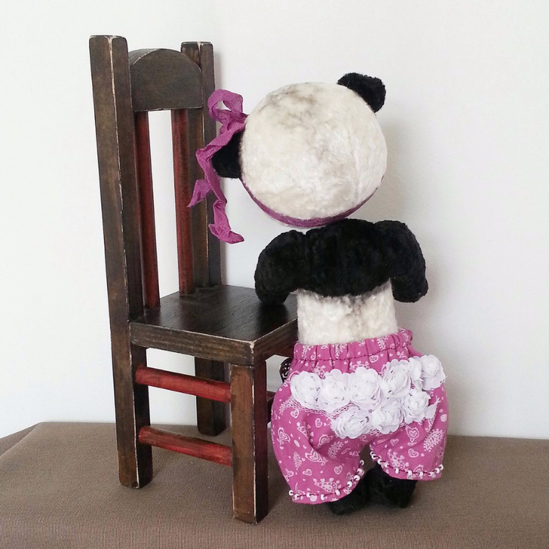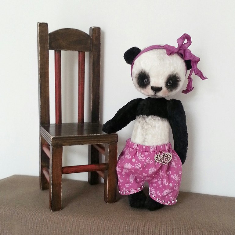 Игрушечный мир - животныеЯ очень люблю панд! Они такие милые создания! Мне всегда нравились пандочки-тедди и решила сшить тоже. И вот - моя мимимишная пандочка! Сшила я ее из винтажного плюша, внутри опилки и металлический гранулят, шплинтовое крепление. Голова качается, лапы поворачиваются. Сшила ее и решила, что это девочка! Сшила ей штанишки, они на резиночке, снимаются. На попе - милые рюшечки)))! Настоящая кокетка))).