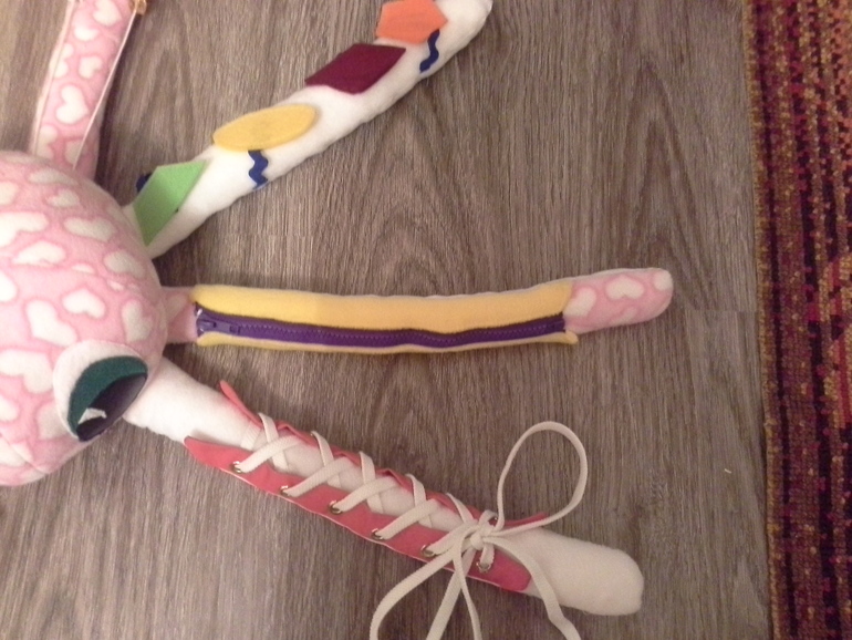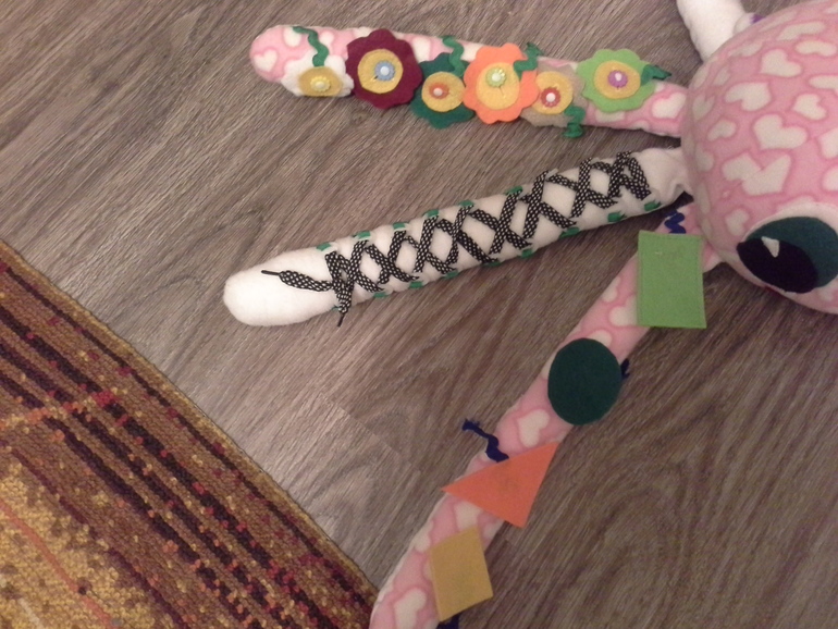 Сзади на лапках резиночка, на ней уточки и бусинки, младшей очень нравится их передвигать.. А на другой помпончики....