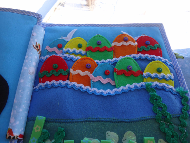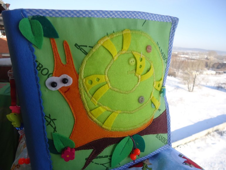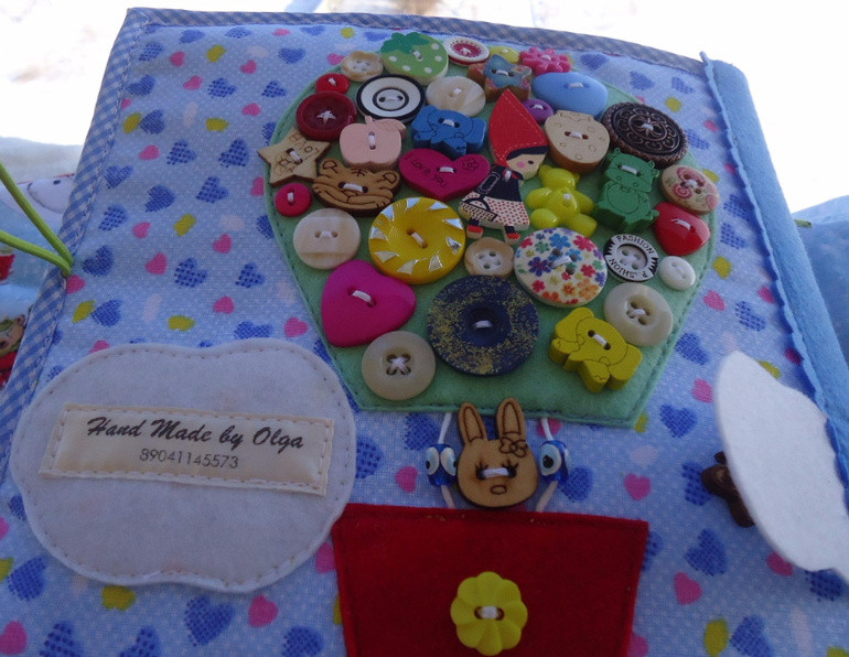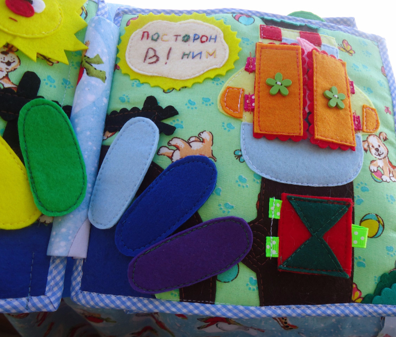 Далее много фото!!! Первая обложка книжки- лабиринт гоняем пальчиками пуговки под сеткой, тренируем моторику ручек) застежка на пуговке, тренируемся расстегивать) первый разворот, эпизод из сказки про Винни Пуха, солнышко на липучке, досточки мостика тоже на липучках, изучаем цвета радуги, составляем по порядку, у Винни пуха дверка домика на пуговке, тренируем пальчики, у Пяточка на дереве спряталась симпатичная сова, ищем сову))) и ходим друг к другу в гости)))