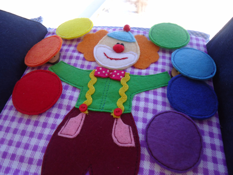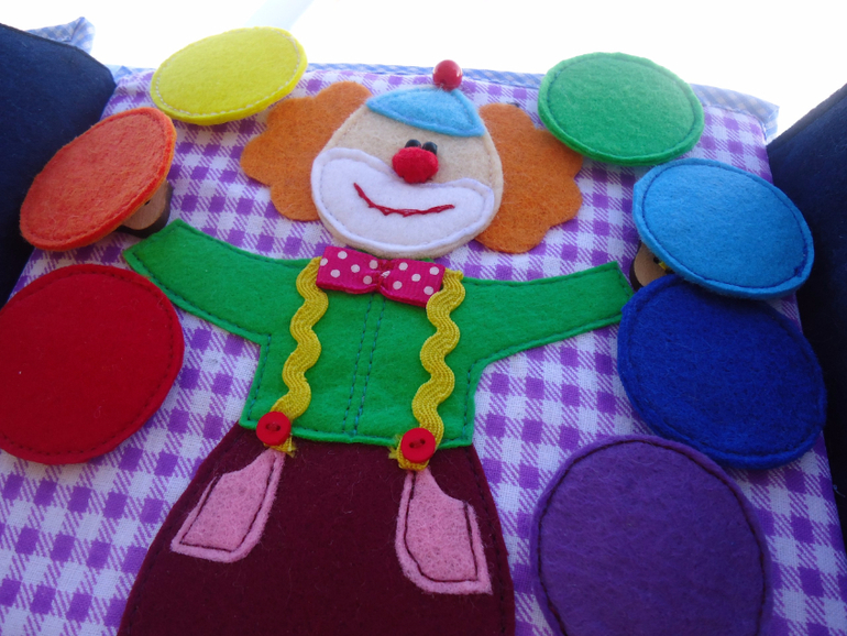 дальше веселый клоун, развязываем и завязываем бантик на дверке, шарики у клоуна по цвету радуги, учим цвета, снимаем и прикрепляем на липучки, трогаем ручки, балаболку у клоуна)
