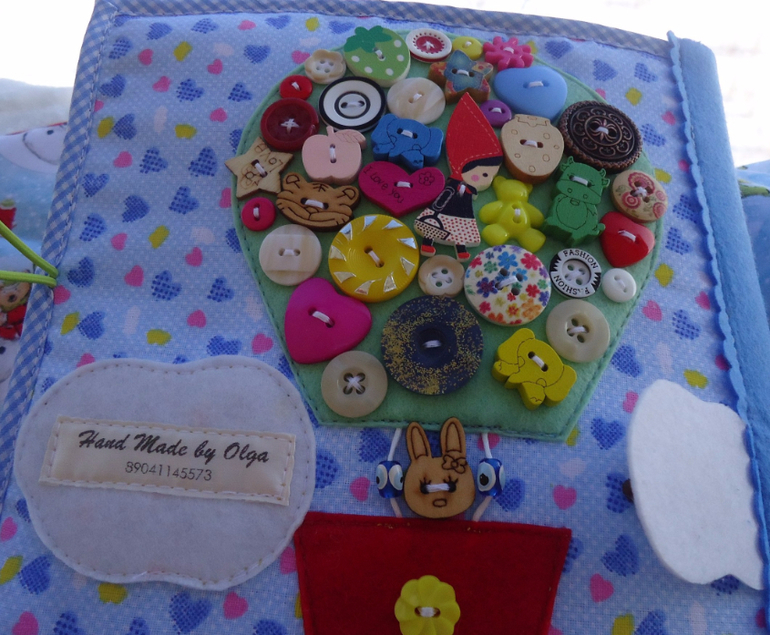последняя страничка, воздушный шар, трогаем и рассматриваем пуговички, ищем бабочку, трогаем зайчика, бусинки).