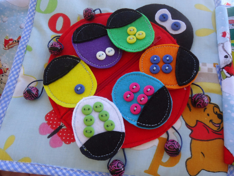 второй разворот божья коровка с детками, учимся расстегивать замочек, прячем деток маме под крылышки, изучаем счет до 6-ти, расставляем по порядку деток на маме) трогаем бусинки)