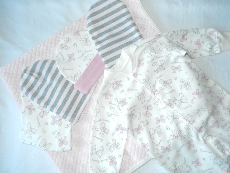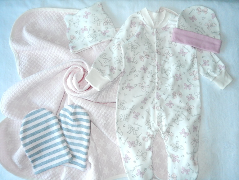 Уютный пледик 90х90 из капитоне Розового с молочными Звездами. Слипик из нежнейшего интерлока «Бантики», размер 68-74. Шапочки, как же без них)), двойные полосатики на новорожденного, с ушками тоже двойная и однослойная с отворотом на возраст 5-6 месяцев. Комплект получился таким нежным и милым