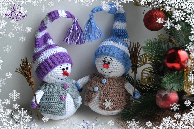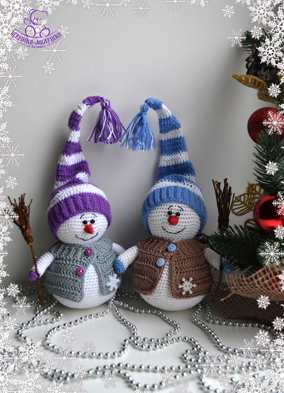 Эти забавные пухлики связаны из хлопковой пряжи Бегония, плотненько набиты синтепоном, в попке пластиковый гранулят - приятно увесисты), глазки-бусинки. Одеты снеговички в полосатые колпаки с кисточками и жилеты, которые украшены пуговками в тон колпакам и снежинкой-пуговкой, а в ручёнках мётлы).