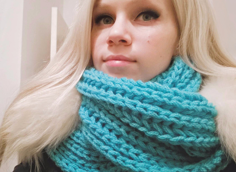 Снуд связан из Семеновской пряжи Глазго 50% шерсть,50% акрил, ушло 2 мотка. Спицы №9. Узор-английская резинка.