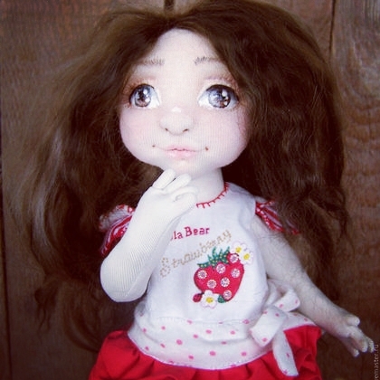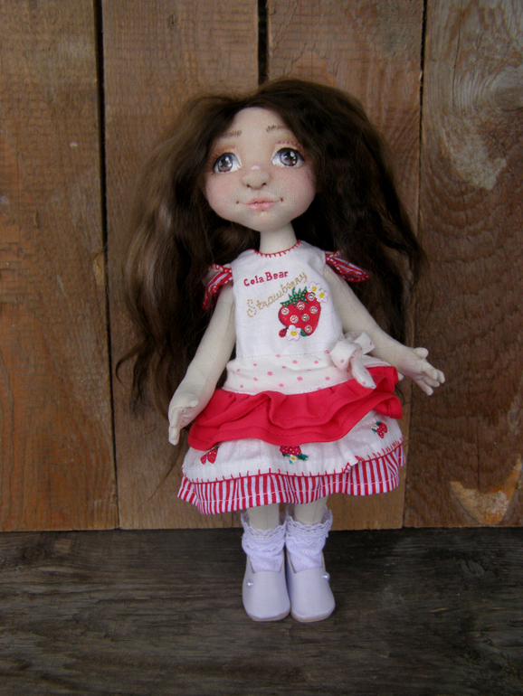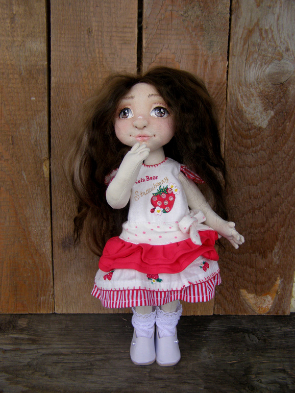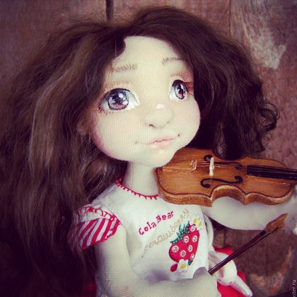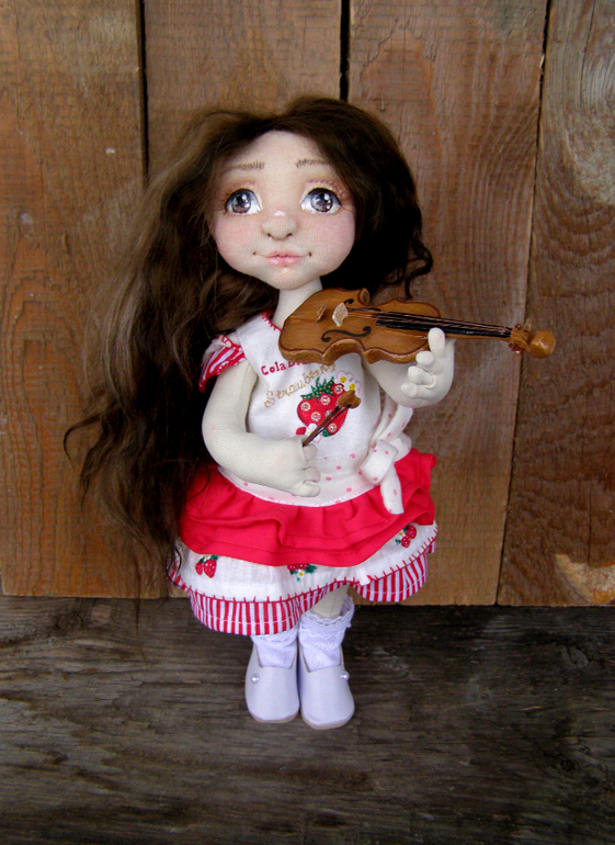Кукольный мир - человекоподобные куклыСшита на заказ куколка по фото.Прекрасная девочка, играет на скрипке, занимается гимнастикой. Стоит и сидит самостоятельно. Обувка ручной работы из кожи с жемчужными полубусинами. Носочки из хлопкового трикотажа с хлопковым кружевом. По платьицу было особое пожелание максимальной похожести, т.к. оно любимое), я очень старалась повторить его. Второй ряд юбочки и перед платья расписаны акрилом и закреплены, можно стирать на руках в теплой воде, гладить через марлю или хлопковую ткань. Вся одежка съемная.Скрипочка сделана из дерева вручную и покрашена акрилом, маслом и покрыта лаком. Есть струнки и смычок. В ручках каркас, может куколка держать легкие предметы. Крепление ручек и ножек пуговичное, также двигаются хорошо.Личико в объемной технике, обтянуто трикотажем, расписано акрилом и маслом.Реснички приклеены. Волосы-овечьи кудряшки...пришиты и проклеены,можно расчесывать редкой расческой или перебирать руками...аккуратно делать причёски. Ростик 32см. Очень мне не нравится как на фото видно прошитые веки, вживую почему-то это не так заметно и сильно бликует трикотаж. Но это все возможности моего древнего олимпуса)). К сожалению, в этот раз могу предоставить только сравнительное фото платья).