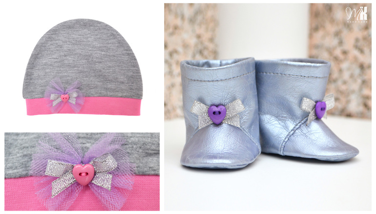 Сапожки из серебристой искуственной кожи тоже украшены бантиками с сердечками.