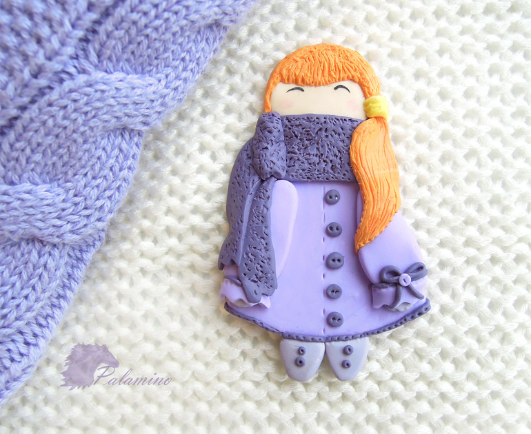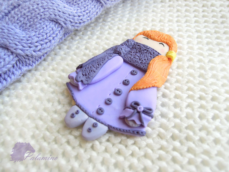 Брошечка из Фимовской пластики. Рыжеволосая модница в аметистовом пальтишке высокая - 7 см. на обратной стороне металлическая заготовка броши.