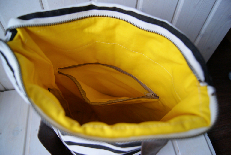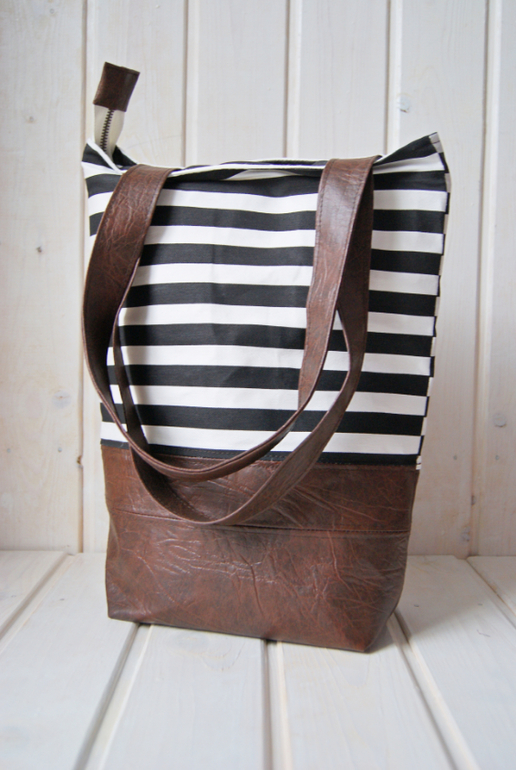 2.Шоппер сшита из качественной экокожи и полосатой джинсы.