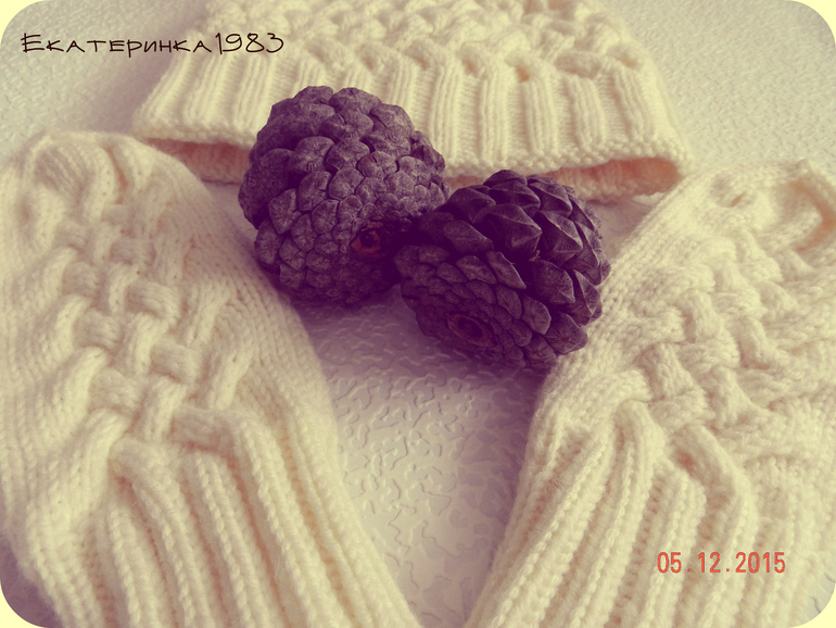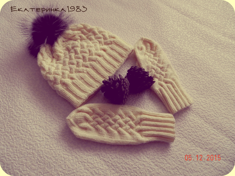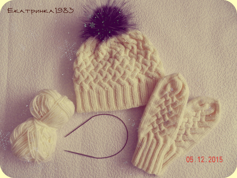 Привет, девочки! Связался у меня очередной комплектик. Рисунок очень популярен в этом году. И информации в интернете тоже много. Я вязала из пряжи Ализе Лана голд классик. 240м/100гр. Сначала набирала петли на подклад, связала см.8-9, затем связала 2 ряда изн. петлями и перешла на резинку, а затем на рисунок. В итоге шапочка с вязаным подкладом. Варежки связала, классическим способом. И фоточки, приглашаю посмотреть)))))