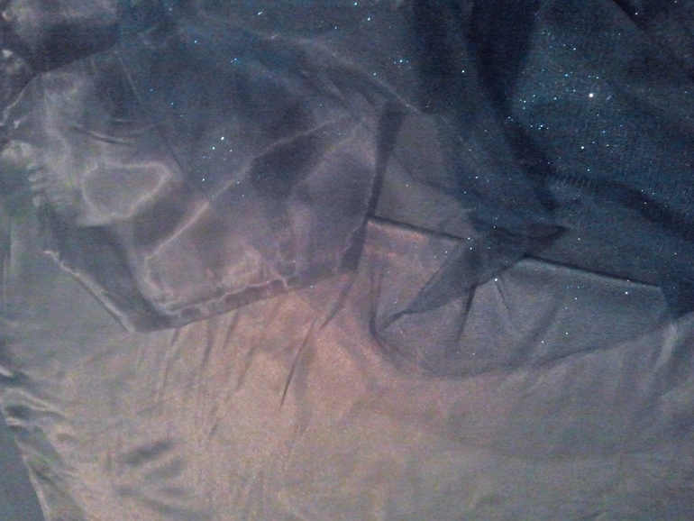 В наличии атлас светло-голубой с блестящим отливом, органза чуть потемнее оттенок, фатин голубой с блестками (в несколько слоев смотрится как синий даже).. и белый фатин еще есть. Думала на нижнюю юбку чередовать белый с голубым.