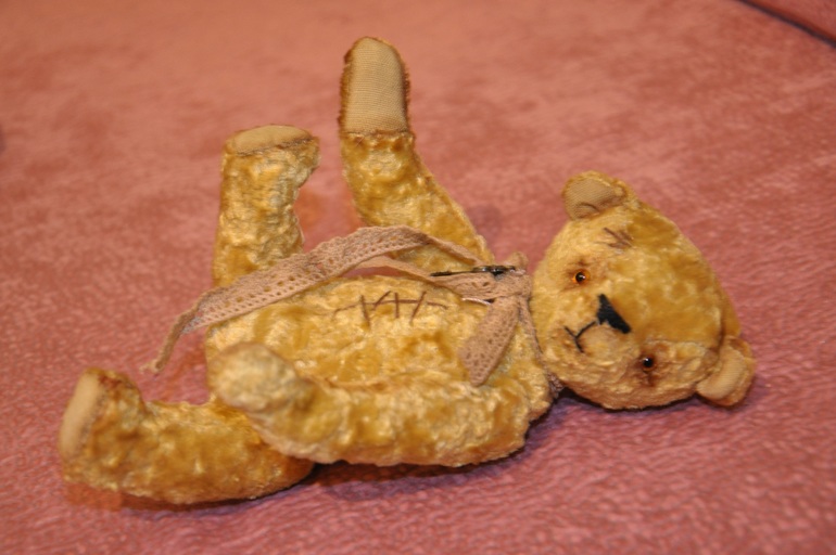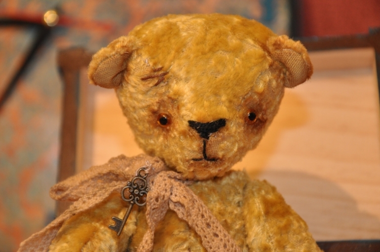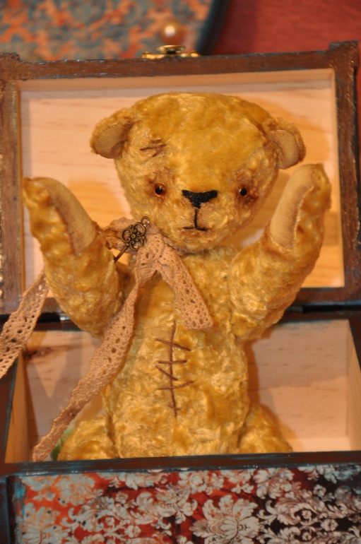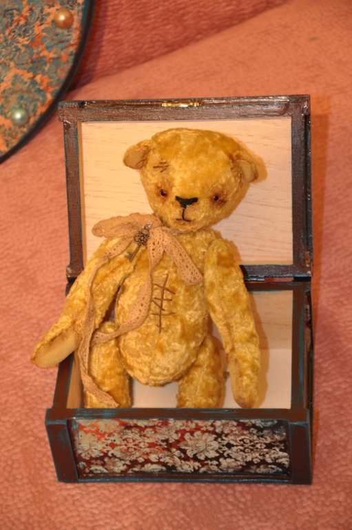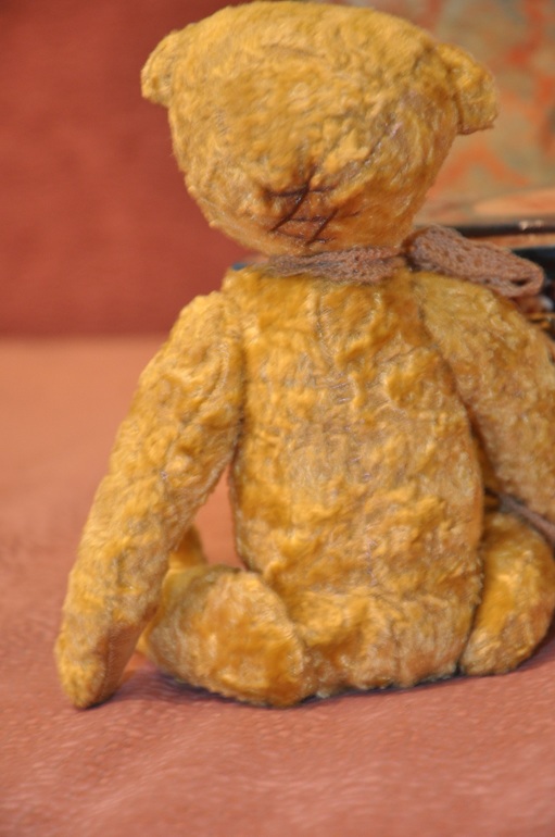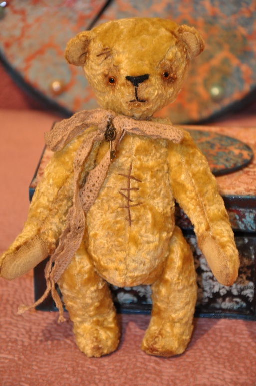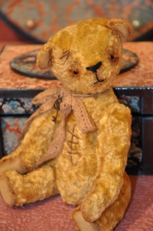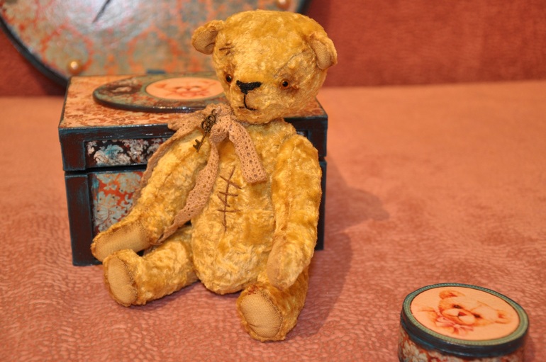 Сшит из винтажного 50-летнего плюша, тонированного вручную. Стеклянные глазки. 6 шплинтов, руки-ноги двигаются. Голова покачивается. Утяжелен стальным гранулятом. Сидит очень устойчиво, стоит в основном с опорой, если хорошо попросить, то и без)). Меня слушается и стоит)) Состарен маслом. Декоративна штопка. Набит опилочками. Рост 19 см.
