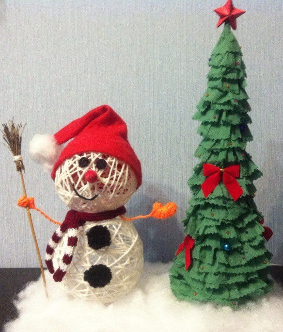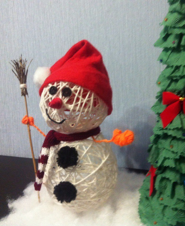 Шапку деда мороза в ашане за 20р купила, отрезала верхушку, руки проволочки, обмотанные ниткой. шарфик связала. Ничего сложного.