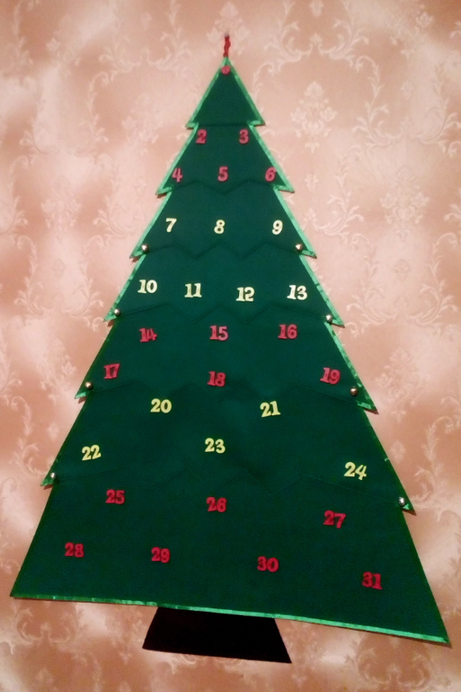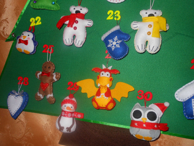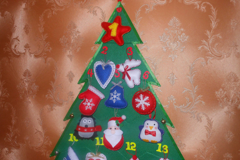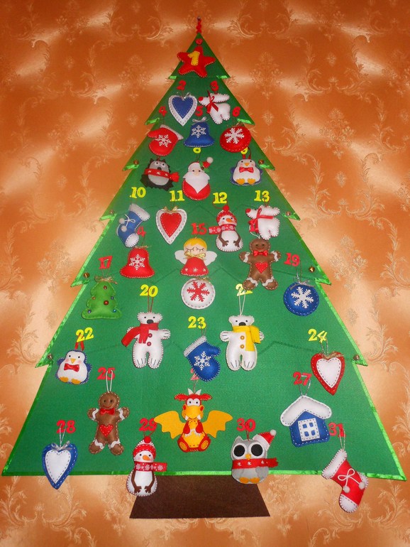 Работа выполнена на заказ. Идея не моя, заказчица попросила сделать елку, как в этом посте. Елочка выполнена из жесткого фетра, высотой чуть больше 90 см, ширина нижнего яруса почти 70 см, сшита вручную, двусторонняя, декорирована бубенцами и атласными лентами. В качестве цифр использованы деревянные пуговицы, на них же развешиваются елочные игрушки, всего 31 штука)))